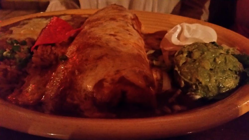 My friend Dave BURRITO RANCHERO - It is a behemoth flour tortilla filled with beans and cheese, with a choice of chicken, pork, beef or veggies topped with sauce and melted cheese. Served with rice, sour cream and guacamole. one got chicken and one got beef neither could finish them