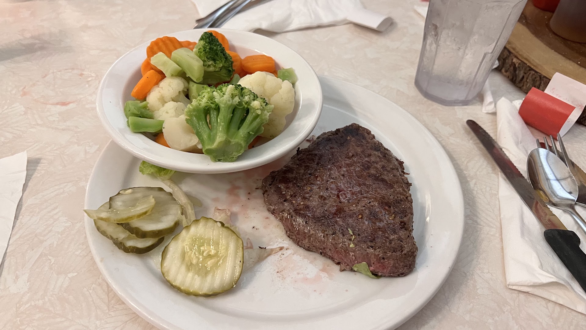 The steak was pan-fried, and lacked flavor, it was thin, and like the rest of the food, it was kind of a cross between Golden Corral and Cracker Barrel. The restaurant is a locals diner, and if I judge it from that perspective, it earned four or five stars, which I gave. As a steakhouse where a guy with a couple bucks can get an excellent steak and a beer? Absolutely not, it would have earned a 2. I know how important reviews and ratings are though, so I am not going to mess over a restaurant because I misunderstood the type of restaurant and quality that it is.