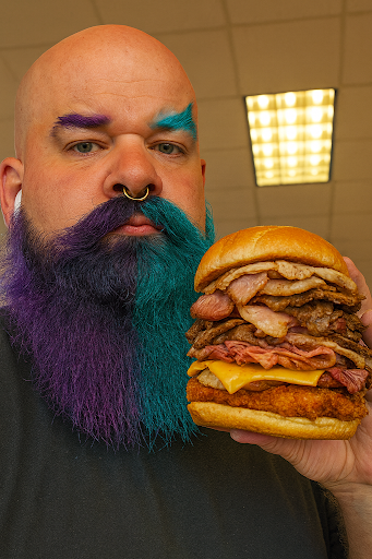 I take bite. Explosion. Sauce shoot out like geyser, drip down beard like holy oil anointing chosen warrior. Arby Sauce. Horsey Sauce. Mystery Sauce. I not care. I become Sauce Man now. Beard hold more flavor than drive-thru menu. Bald eagle fly overhead. I salute with curly fry.