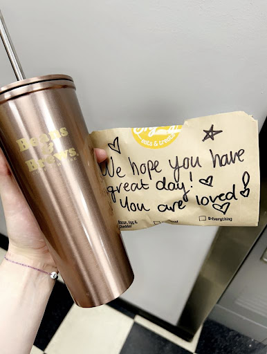 I got my best friend a pumpkin pie chai drink with cinnamon chilled. I bought the drink and a tumbler for her because she loves rose gold. Beans n brews were so nice, I explained I needed a drink that she would like and that I didn't know what to get, I explained what things she likes and they came up with that. She had a horrible few days with her partner. He had been cruel and abusive, and she was hurting. I wanted to cheer my friend up. The wonderful girls there even offered to wash the tumbler and put the drink in it, so we did that. Then they threw in some free donuts and wrote on the bag for her. I'll show you. It was really an amazing morning. I wanted to reach out and say thank you to your company and to the amazing employees who work for you. They really helped cheer up not only my friends day,...