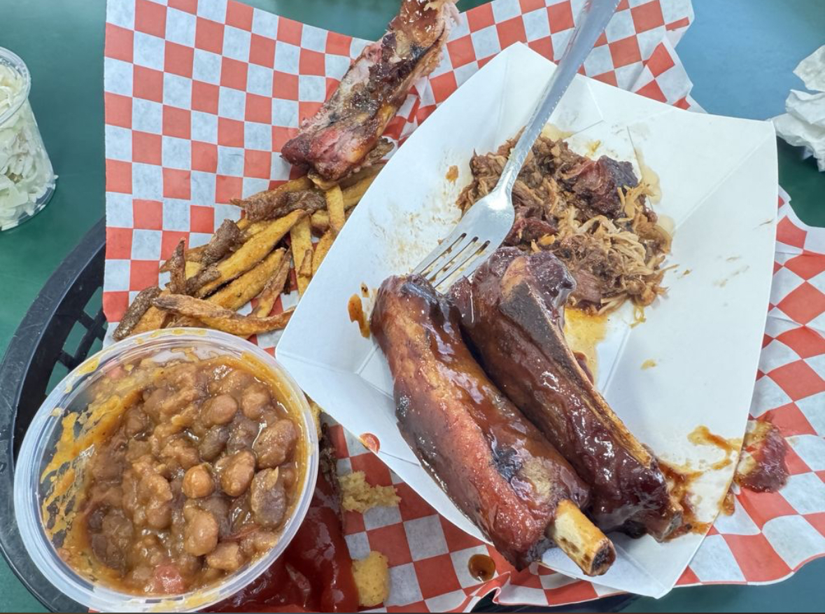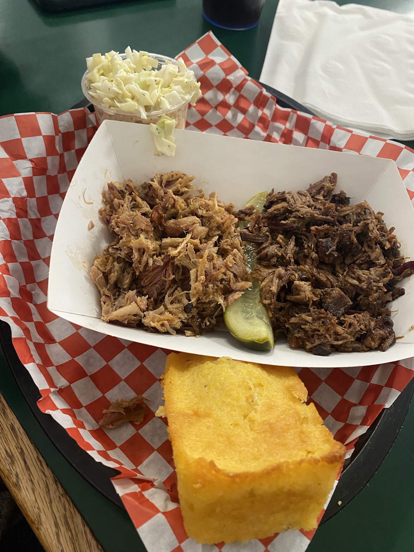 Read moreI would not recommend this place. I was raised in the south and this is NOT BBQ. It tastes like it's baked, not smoked Food is not good. It's overcooked and bland. We only ordered two things and they brought out a wrong order. Atmosphere is absolutely terrible. Can not have a proper sit down meal here without other patrons hearing your conversation. It is awkward and dingy with gross carpet and dirty tables and chairs. Small dining area anyway with not a lot of seating options. A little bit of music here would go a long way Way overpriced for what you get. Menu doesn't even have prices listed on it, and a lot of the prices are blacked out