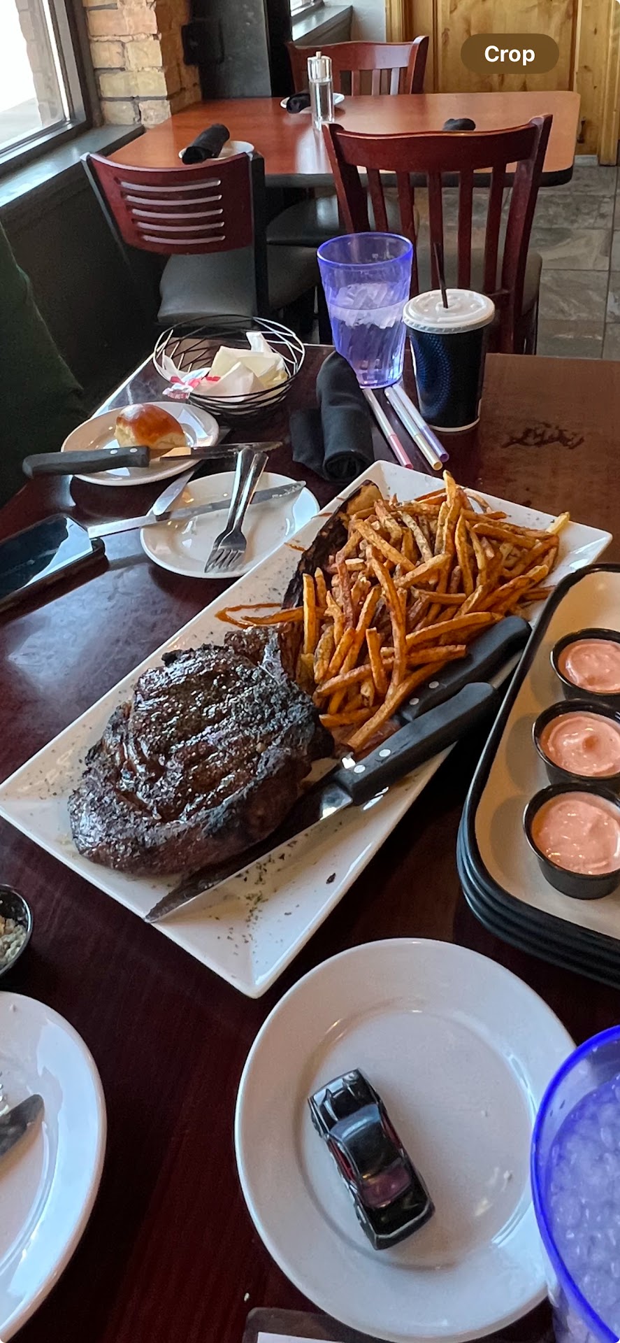 Read moreWe came here a few weeks ago for the first time and had a wonderful experience, so we expected the same today. It was the polar opposite. We were there for an early dinner at 5 pm; there were not a lot of other diners there. Our server (Jody) took our order and brought out the appetizer (raptor tail) and waters. The appetizer was delicious. We both ordered the 8oz wagyu steak special. I added some scampi shrimp. I chose the garlic parmesan fries-based on her recommendation- and salad; my husband ordered mashed potatoes and clam chowder. Jody eventually brought the food and said she'd be right back to check on us but quickly left before I even had a chance to ask her to bring water (I ran out while waiting for the food). My steak was not good. Wagyu is usually very tender and flavorful due to a marbeling throughout the cut...that is why it's more expensive. Mine didn't have any marbeling and was tough and overdone. The fries were greasy and soft, so I couldn't eat them. I also wanted to order a side of vegetables, as I misread the menu and thought it came with asparagus. I still wanted a refill of water. Jody didn't come back to check on us. I flagged down another server who was in our area, and she offered to bring more water and put in the order for the vegetables. I ended up eating some of the steak (I had planned to ask for a different cut, but my blood sugar was dropping, and I had to eat something to avoid a low incident). Jody came over to drop off the vegetables toward the end of our meal and noticed someone else had brought more water and then disappeared again. We sat there for about 15 minutes after finishing our meal waiting for her to come back, and finally had to go to the hostess to ask her to find someone to bring the check so we could leave. She dropped it off and quickly left again. I have no idea why we got such horrible service this time, but it was not deserved nor appreciated. I give 0 stars for service, and even though the raptor tails were a 5, the entrée was not up to...