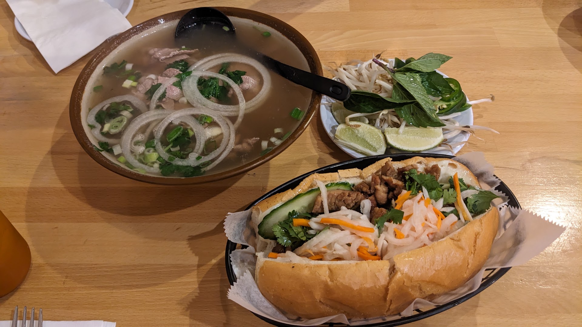The grilled pork banh mi sandwich was exceptional - crusty French bread filled with savory marinated pork, crisp vegetables, and the perfect balance of sauces. We washed it all down with refreshing Thai iced tea that complemented the meal beautifully.