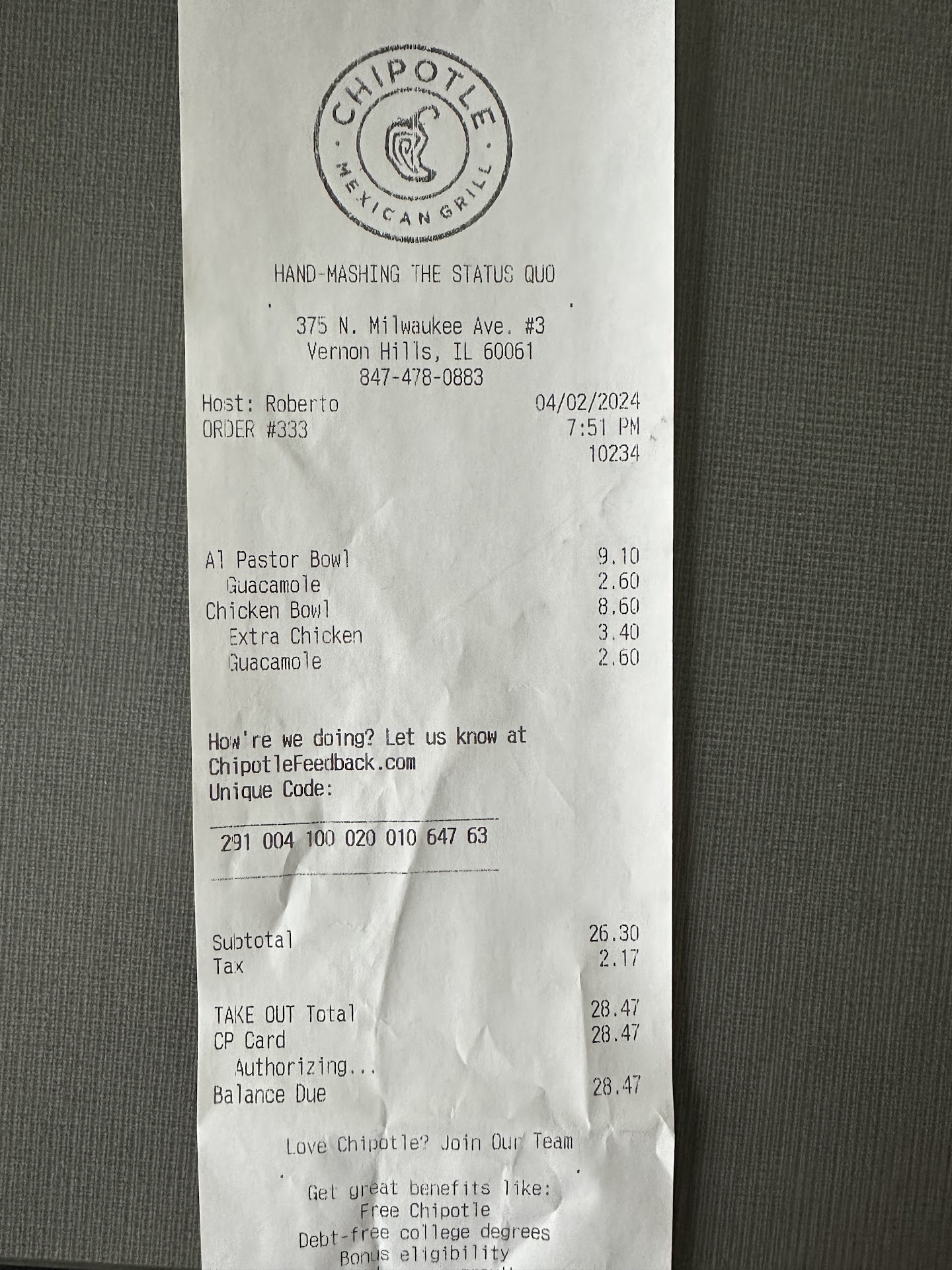 Funny enough, the staff in Vernon Hills is extremely stingy with their portions of chicken. We order double chicken but they serve a full spoon for the first portion and a half spoon for the second portion. Does Chipotle train its workers that the meaning of “double” is 1.5X? And what kind of compensation practices have resulted in such a scarcity mentality among your staff that they zealously guard the chicken as if it was their inheritance?