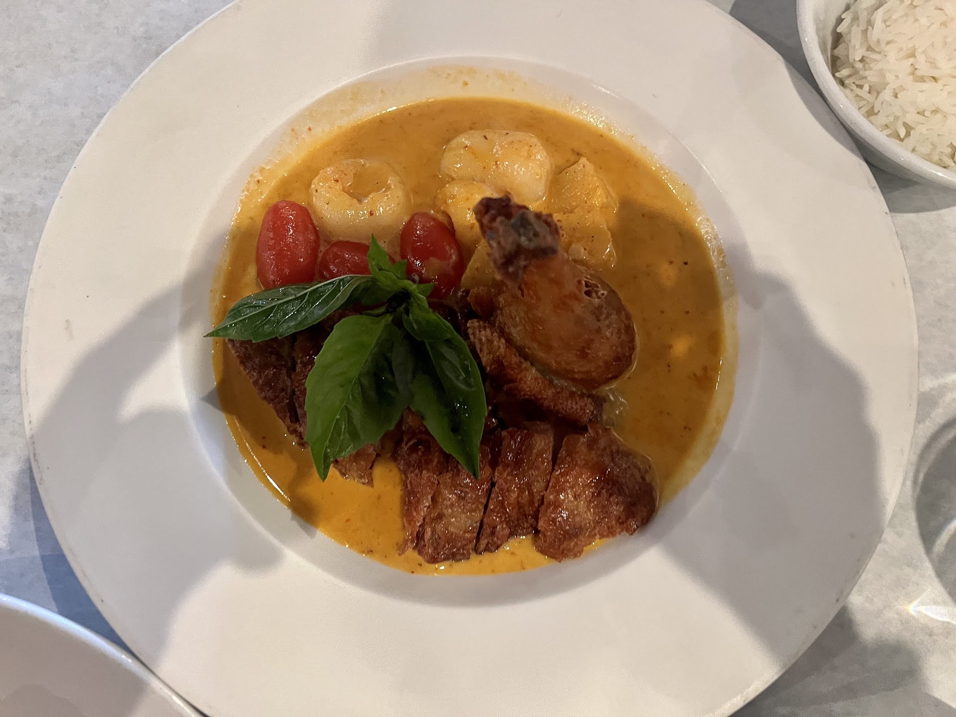 We were there yesterday. I had the Roasted Duck in Curry with Lychee and my wife had the fried Thai combination rice. For an appetizer, we had the green mussels steamed with Thai spices. The mussels were cooked to a perfectly rubbery texture, with just enough grit left to make them completely unpalatable. Strike 1.