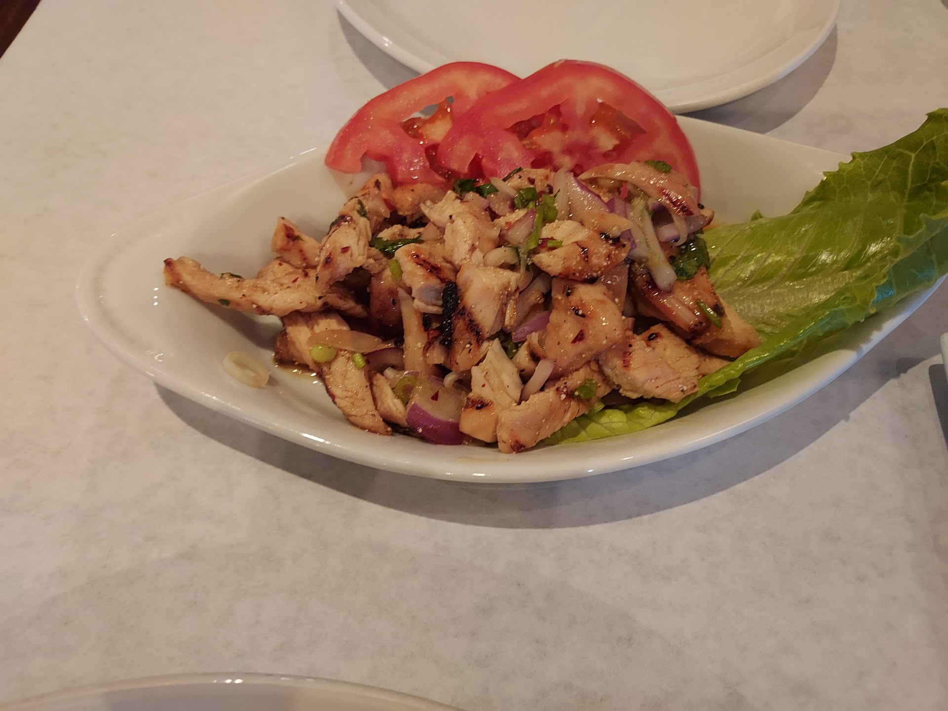 Our entrees arrived just as we were finishing our second glass of hot tea…perfectly timed. My beef salad was tender, marinated in a light citrusy vinaigrette with crisp lettuce and fresh vegetables. My wife’s coconut curry chicken…excellent, as well, full of tender, spiced chicken in a rich, coconut green curry sauce and basmati rice. Huge portion…really enjoyed the sampler, and enjoyed the leftover curry chicken for lunch the next day. I was the envy of the lunchroom!