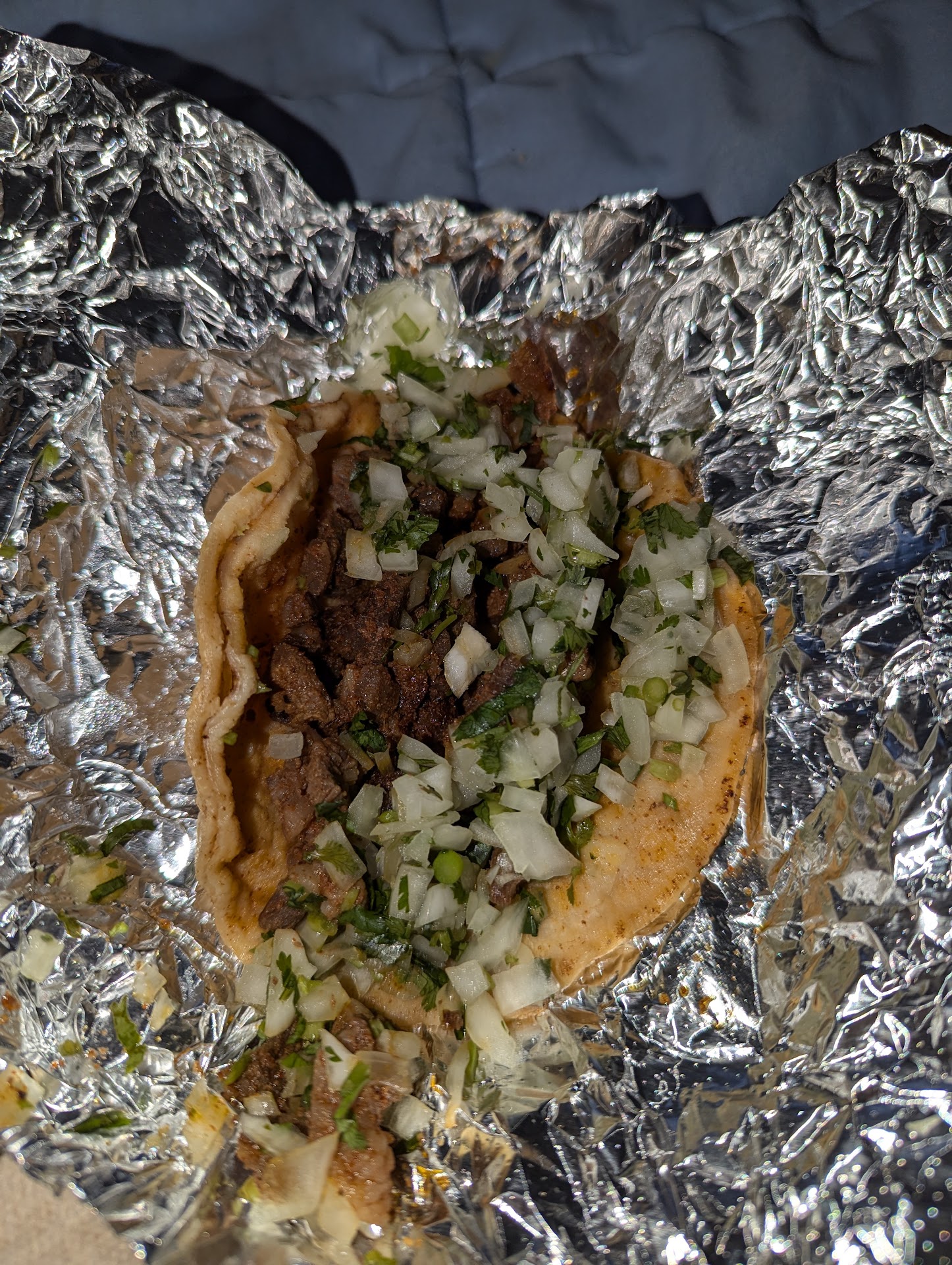 Great little place to grab affordable and tasty tacos. We’ve been here twice in the last two weeks and tried a few. All of the tacos we tried were dressed traditionally with onions and cilantro.