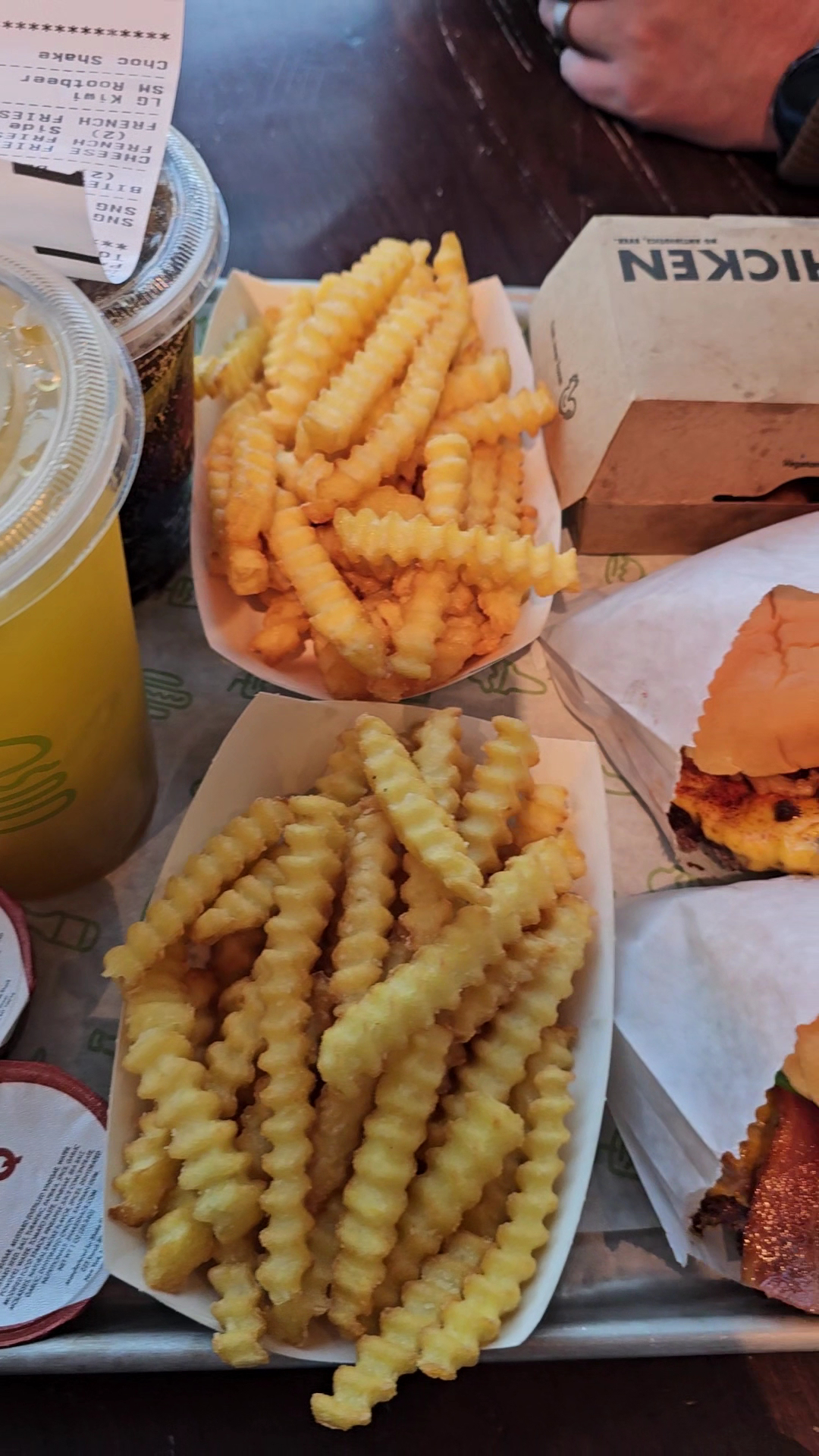 Read moreWe decided to stop here on Saturday after a long morning in Chicago. It was our first time and after checking out all of the restaurants this one seemed like the best to get in and out, eat well and continue home. We walked in, no greeting or instruction on how to order, which ok we figured it out not a major deal breaker. We order our food and it is quite expensive for being a burger and shake place (for 5 people almost $100). My husband got the churro shake, nacho fries and a bourbon burger...no meal deals everything is separate. I got a 10 piece nugget, bacon cheese fries, and drink. My kids got 2 bourbon burgers, chicken sandwich, fries, 2 fruity drinks they'd settled for because they were out of the drink they wanted and another shake. We go to sit down and ALL of the tables not occupied were dirty. My husband asked if someone could come clean the tables and a young lady eventually came out to clear the cans but did not wipe tables or even come back out. He then got some sani wipes and cleaned our table himself. Now to the food. The 2 stars are for the taste of the bourbon burgers and a shake. Everyone said they were good and my daughter enjoyed her chicken sandwich. However my husband's churro shake had lots of chocolate and no churro...when he went up to ask if it was the right shake they said they were out of churros. My nuggets which remind me of a crunchier chik-fil-a nugget piece were nothing more than lots of breading pieces. The pieces of chicken I got the breading fell right off. My fries tasted like churros....as if the churros are fried in the same grease or maybe they fell in there hence no churro shake. Very disappointed especially for the amount of money spent. See pictures...