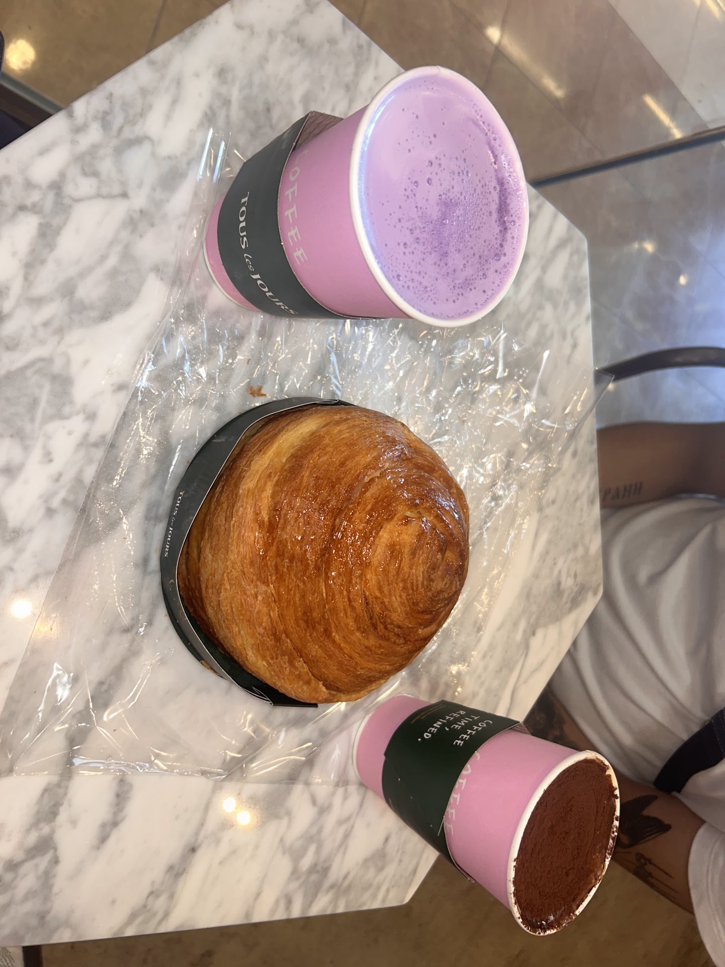We got a cloud latte (semi sweet latte with sweetened condensed milk as sweetener) as well as a cafe mocha, also semi sweet, both were divine. Cloud is exactly how it sounds and is very foamy which I enjoy. We also tried their blueberry yogurt cake today, and it was a well rounded treat all around. We had to grab the giant croissant again...