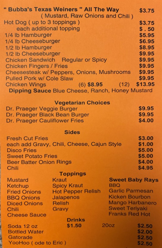 For Bubba's to succeed they need to establish a niche of customers who make it a point to go there on a regular basis. Quite frankly, between the location, the prices and the menu, I don't see that happening. The hot dogs are $3.75 each, which ain't cheap for a dog. Even more annoying is they hit you with a surcharge for using plastic, which is such an outdated concept for 2024.