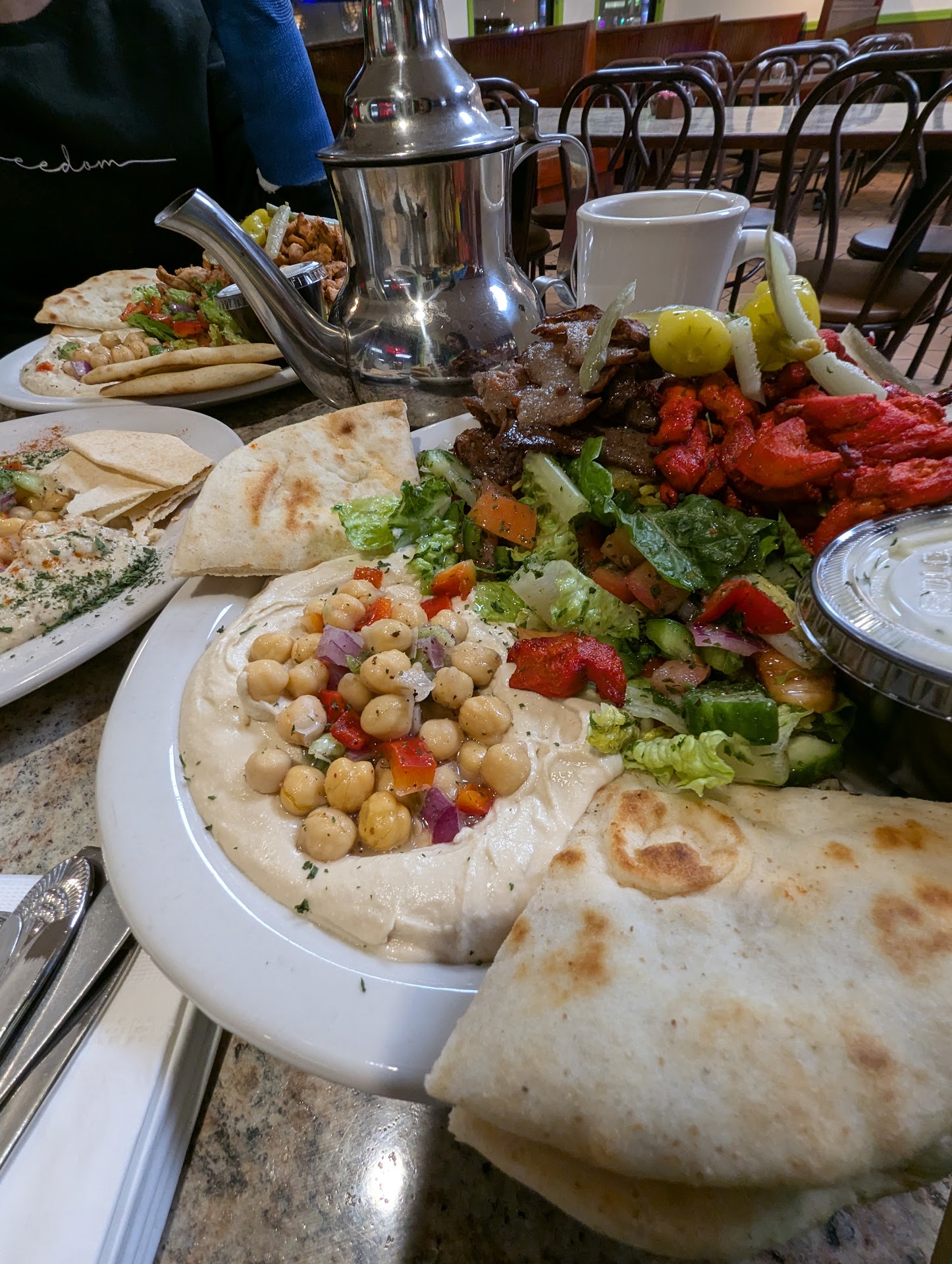Read moreMy husband and I enjoy Lebanese food, Mediterranean food so we stopped in to try this place. We were met by a man in all black with visible food on his clothes front an back. Obviously had been cooking with no apron an had wiped his hands on his rear. This should have been our sign to turn around but he was very nice so we decided to sit anyway. He said since it was our first time there to try the entree. We did we got the 2 meat platter an a chicken shawarma wrap. The shawarma wrap was ok unfortunately chicken didnt seem seasoned. Overall maybe a 5 out 10 compared to other places. The entree we ordered was the lamb shawarma an spicy chicken shawarma. The dish came with bread that had clearly been previously heated an stored an served to us unfortunately. It was like trying to eat cardboard with hummus on it. The lamb was very dry. The spicy chicken was the best of the 3 meats we tried it had flavor an a kick which was nice. The hummus was good but unfortunately no bread to eat it with. Overall we were disappointed, based on the previous reviews we were excited to try but sadly not accurate for us. Which was my main motivator for leaving this review. I hope the owner sees this an makes some necessary changes. Unfortunately this place missed the mark an details like fresh bread an a clean appearance would have us give this place...
