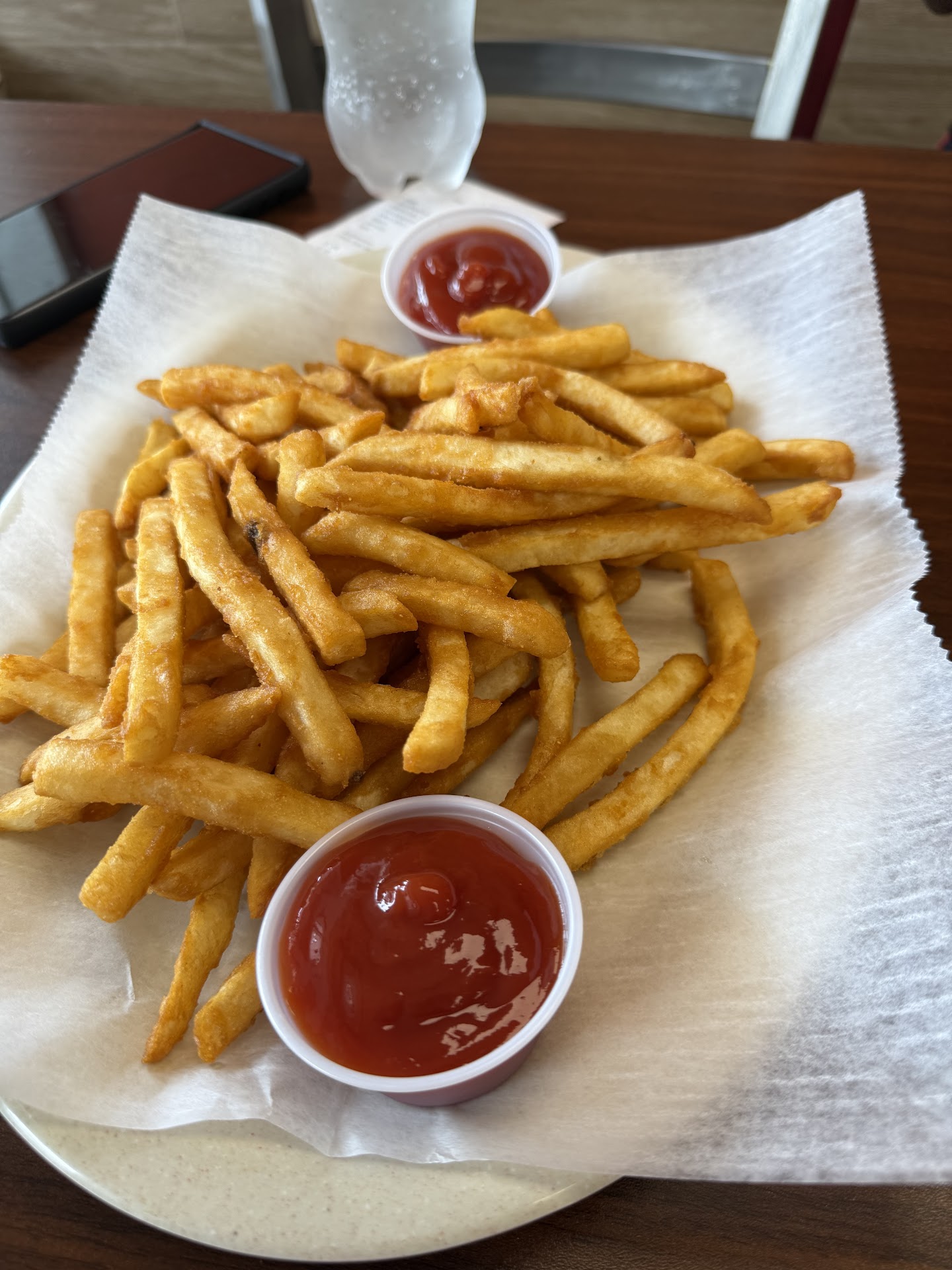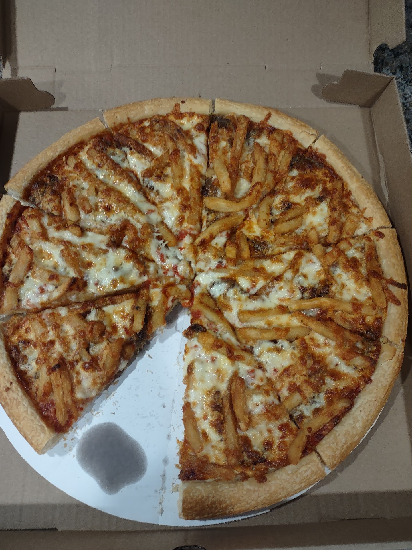 First, customer service was 10/10. Juan waited on us and was very polite and we didn’t feel rushed to order. We ordered regular fries, a large meat lovers and 2 drinks. We also opted to dine in and the atmosphere was very clean and comfortable. We didn’t feel like we waited long for our food to arrive at our table, it was probably no more than 20mins and it was delicious. Crust was perfectly cooked through and everything tasted fresh. Juan checked in on us occasionally and was very kind to offer us anything we needed.