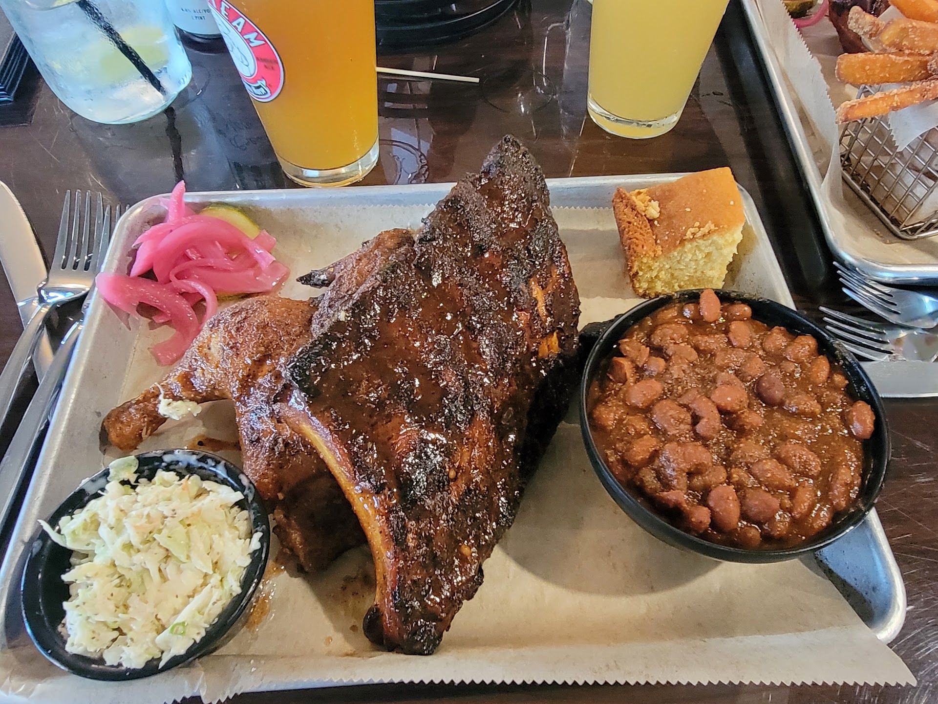 The food left quite a bit to be desired. Appetizers are insultingly expensive ($12 for fried pickles and $12 onion straws?! $12 for garlic bread?!). We got the burnt ends and the Korean sticky ribs, which had okay flavor but were very dry. Had to cut with a fork and knife and add BBQ sauce. Not tender. The Mac and cheese was creamy and cooked well, but lacked flavor and salt. The mashed potatoes had literally no salt whatsoever, but a good consistency.