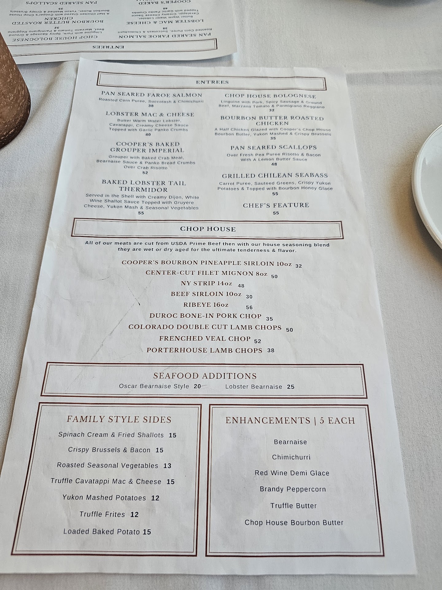 Read moreI have been to Cooper’s chophouse at least four times prior and tonight will be the last. We brought guests from out of town to Cooper’s, hoping to have a great experience. The server we had tonight we have had one time prior and she wasn’t very attentive then either. One of our guests ordered a steak cooked medium and they received a steak cooked rare (We know this from the puddle of blood left behind on the plate). My daughter ordered the bourbon chicken, which we have had several times before and it was good. Unfortunately, this time it came out barely room temperature. I ate the leg quarter and had to stop where it’s connected to the thigh because it was fleshy and would not come off the bone. The mashed potatoes were also room temperature. The brussels sprouts were hot and tasted good. My boyfriend ordered the pork chop medium well and it came out medium rare. His son ordered the grouper and it too was undercooked. I went looking for the host since our server did not come to check on us after we received our food which my salad arrived five minutes after everybody else got their food. I explained the problems to the host and I was informed that we were more than welcome to send anything back to have it cooked more. How embarrassing to ask for that many dishes to be re-cooked. My boyfriend was the only one who had his food sent back because let’s face it, how many people enjoy complaining about their meal and would rather just suffer through. When they brought his pork chop back out, I gave them my chicken and told them they could take it back because it was not hot and undercooked. They tried to tell me that it was pink due to the bone marrow. I explained to them that it did not come out hot and it was fleshy and would not come off at the bone. I guarantee if an inspector had done a temp check it would have failed. When we were getting ready to leave, I was handed an envelope with a gift certificate to come back. A kind gesture, but I don’t feel worth it. It is embarrassing to bring guests out to dinner and have this kind of service and food. I suggest the Tides to anyone looking for a nice meal and...