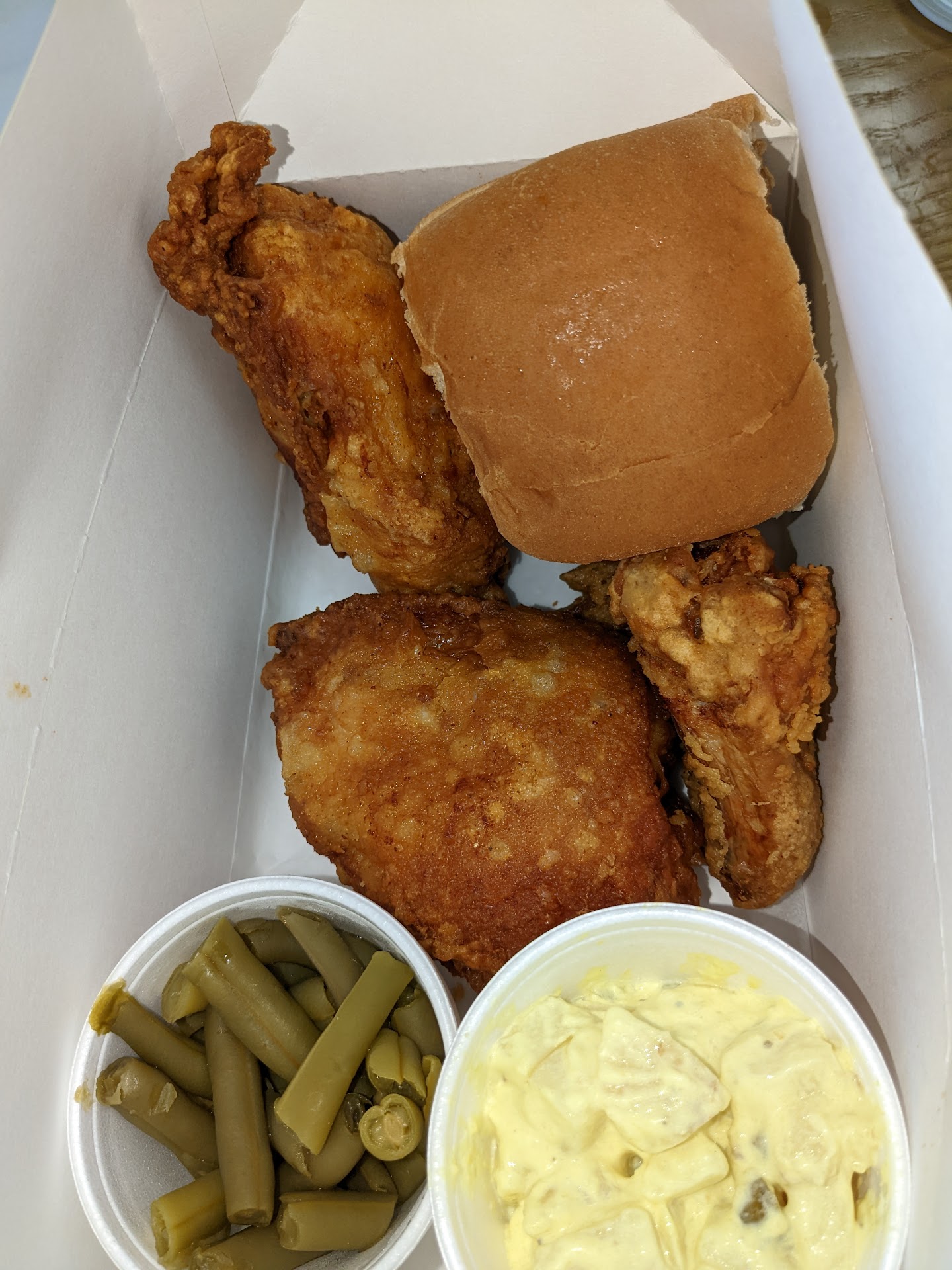 Read moreAfter hearing how delicious this fried chicken was, I just had to try it while in Florida visiting my mum. Unfortunately, I was disappointed. The chicken was indeed crusted with a thick enough crispy coating, however, the spice was definitely lacking in both the crust and the chicken itself. I ordered the 3 piece, which included a wing, thigh and breast, two small sides (green beans and potato salad) a dinner roll and a large sweet tea. The prices are very reasonable for the quantity of food you receive. The beans were under-flavored and the potato salad was good. The sweet tea ( from scratch) was DELICIOUS!! Best I've had since being in Florida on visit. The atmosphere is reminiscent of a cafeteria. Our cashier was kind and friendly, which definitely made the experience way better. The tables were dirty in the dining room and I ended up wiping them down myself before eating. This would be a good quick lunch or snack option. I think a deviation from the recipe to add for additional spice in the chicken would do wonders...