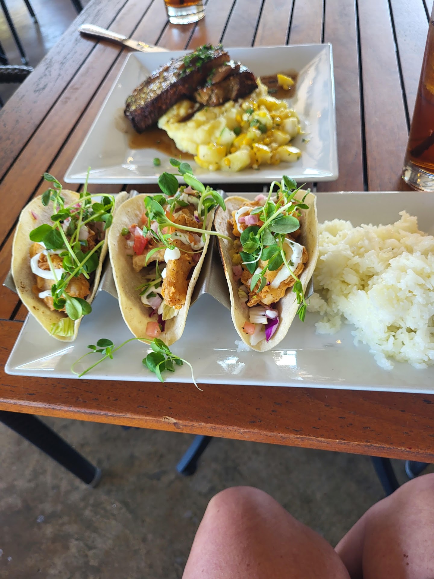 This was our first visit. We had not previewed the menu and only one friend has told me she has been there (for pizza and drinks). We were tired and hot. He from working around the yard, and I from having just returned from a 4 day visit with family. And, we rode to the restaurant with the top down, so our hair was outrageous, and my clothes didn't even match! We arrived 30 minutes before opening and nearly went elsewhere. That would have been a BIG, HUGE mistake. But, we decided to visit the art gallery a few doors down (and you should, too!). When we returned, we were kindly greeted, in spite of our appearance. We were informed that the reservation list was full for the evening, but if we thought we would be finished within an hour and 45 minutes, there was availability. (I appreciate that because I have been delayed getting a reserved table in the past, due to lingering patrons). So, we were seated and within minutes, our server, Pedro G. greeted us and took our drink order, a sweet tea, and my unsweetened tea. Now, this may sound crazy, but this was the BEST unsweetened tea I have EVER had. It wasn't bitter, sour, or sharp, like unsweet tea usually is. I wish I could make it that good at home. When Pedro returned, we ordered our entrees. Pedro was asked whether he recommended the Grilled Meatloaf or the....(we will never know what the other entree was because) Pedro quickly stopped the question with his answer, "No contest, the grilled meatloaf." Then Pedro asked for my order. I said, "Well, whatever is 2nd best"! No, I ordered the fried fish tacos. That day, the fish was Cobia. It was outstanding. And, Pedro was correct, the Grilled Meatloaf was fabulous. I highly recommend it, and the gravy was perfectly proportioned to not overpower the flavor of the grilled meat. I do not want to ignore the sides. Mashed potatoes and mixed vegetables were with the meatloaf. There was yellow squash and corn (I think shoepeg). Amazing. It was not overcooked, or over salted, or over buttered. It was tasty and had a fresh, pleasing crunch. My sides were black beans and white rice. Since I despise black beans, Pedro suggested double rice. I am not a fan of rice, either, but I was once again blindsided with how great this rice was. It did NOT taste like a clump of starch! It had a flavor I cannot describe. It did not seem to be the standard "chicken broth", but perhaps a brine or vinegar. But it wasn't sour or sweet. It was just GOOD. I did not mention that this was my birthday, because we didn't want any extra attention, nor anything "free", and I can wait another year to be serenaded! And, since I had been blessed with too many birthday pastries this week, we were going to pass on the desserts. BUT, because the entrees were so good, we could not help but wonder how good the desserts might be. We decided to share the Banana Butter Cake. WOW. It was light, not overly sweet, and the perfect finish. We were not able to finish our entrees since we wanted room for that dessert, and Pedro had brought us a carry out container for the remainder. I don't want to forget to mention the impeccable service. Pedro was observant and kept us hydrated without us ever having to ask. The staff and management stopped by our table to see if we needed anything several times, but were never intrusive. It was an overall exceptional experience and we intend to visit in the future and try the pizza. PS: I forgot to mention the garnish! The garnish on the tacos reminded me of a wild weed, that as children, we would pretend to make salads and have picnics with, and eat them from our yards. We were told they were "micro greens". But, I would not have been upset if they had said it was wild sour grass! It paired perfectly...