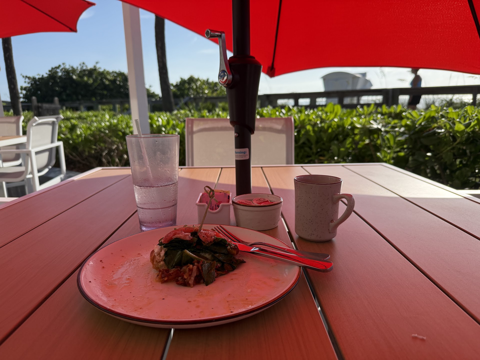 The temperature outside at 7:30 am was PERFECT, The Breeze was soft and gentle. The Red tilted umbrella, shaded my eyes,