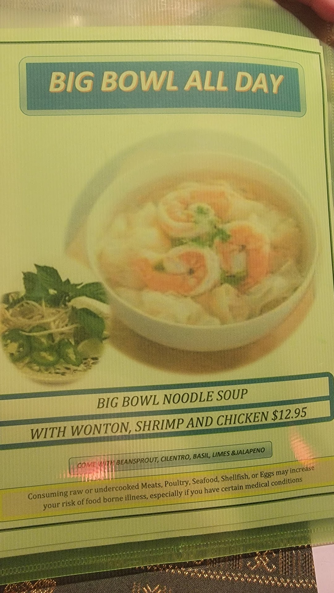The thai beef pho was amazing. So delicious and big portion. However, their service has drastically changed from the last time I was here. Dirty utensils and dirty plates. That was easy to fix and the girls serving us handled it well and brought us clean ones immediately. They did not bring out two of our entrees leaving two to starve while the rest of us ate. Their really fresh fish from the past also was not as fresh and so the two in my table that ordered sashimi and many rolls were disappointed. It’s a shame because the family and I were looking forward to coming here since the Noodle house was one of our favorite dinner spots when visiting Vero. If the other two meals came out, I’m sure the rating would have been higher since it seems like the non sushi food is delicious, but it’s a shame how our dinner experience went this time.