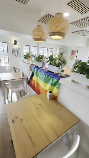 They have a wide variety of seating both inside and outside, with a combination of sunlit tables and cozy nooks with couches. Also, there's a curated collection of posters for local events that looks fantastic. I can't recommend this...