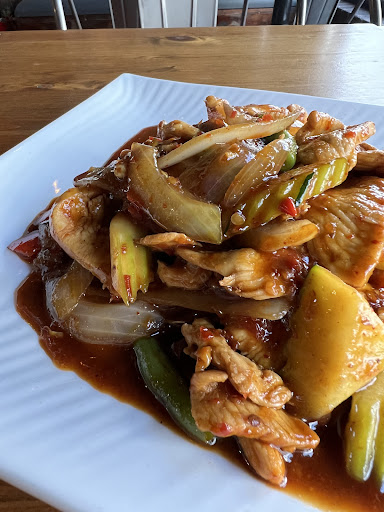 Chicken, string bean, onion, bell peppers, Thai basil stir fried in spicy sauce and served with white rice.