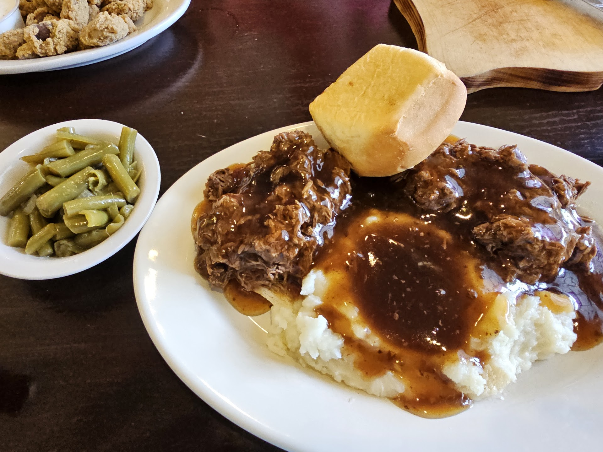 Read moreI always expect great things when I go somewhere to eat and as things happen I score down from there. When we stopped here, my first impression was grand. It felt like we were stopping for a meal while on vacation in Kentucky or Tennessee. We stopped for breakfast today. (I was hangry!) First off, the menus felt icky. I like to create my own breakfast with what I order. Wanting pancakes, eggs & bacon. I like sandwiching my eggs in pancakes and top with peanut butter. Peanut butter chips is offered on the menu, but those aren't appealing to me. So, I asked if they had peanut butter. "Yes" So, I asked for some on the side. The server, instead of having the conversation about having the chips vs. the spread (would I like that instead) chose (for me) to have peanut butter chips put into the pancakes. She didn't bring syrup either. I didn't know the chips were in the pancakes so we waited quite a while for her to come back with coffee refill to ask for peanut butter and syrup. I didn't say anything about the difference between chips and peanut butter. I just ate it. The other servers seemed more present than ours. It...