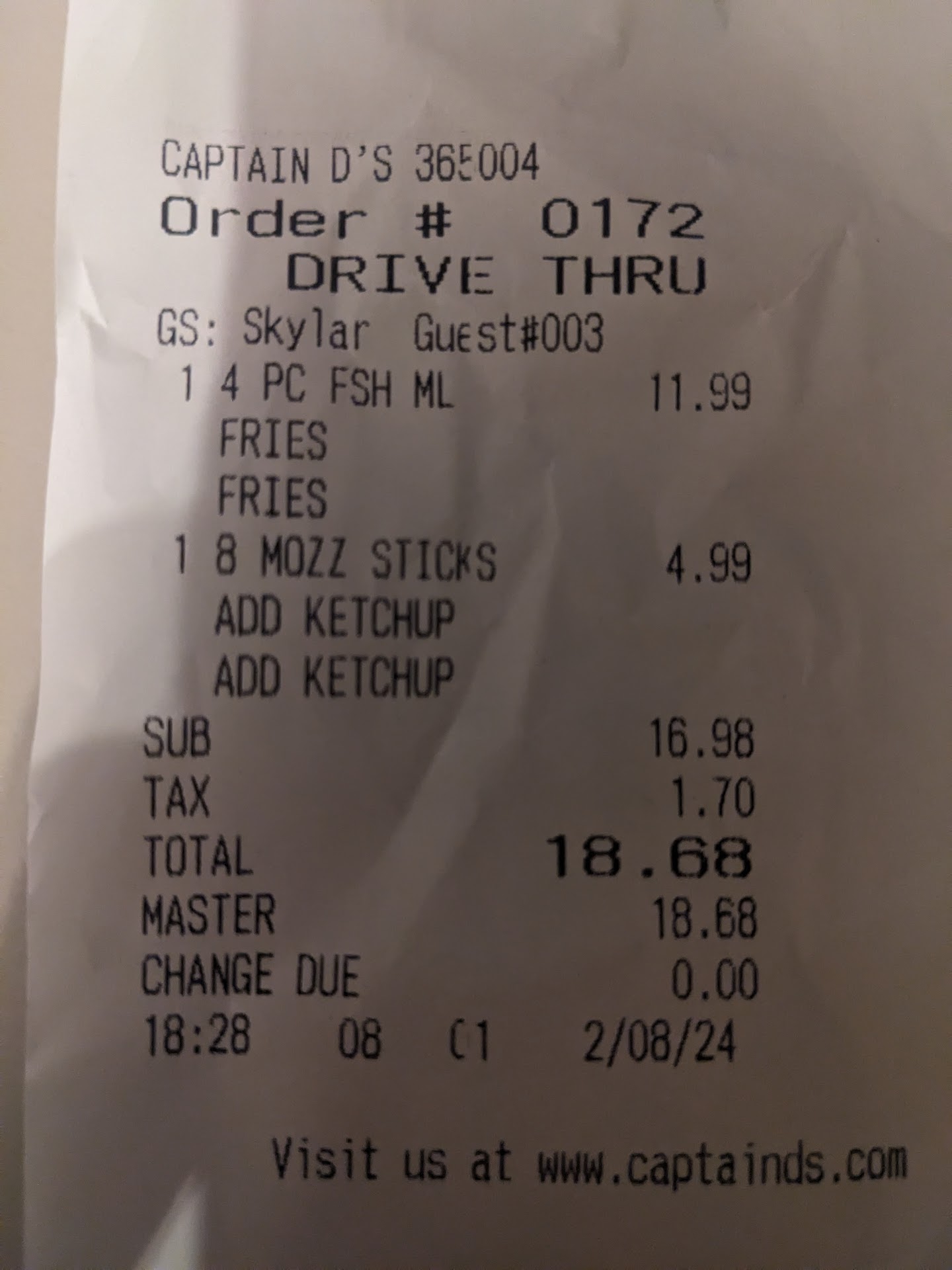 Read moreCaptain D's is drive thru only , or order ahead and curb side delivery in Vicksburg right ,due to the Pandemic restrictions. We received our food from the drive thru. My favorite there is the Catfish Special. It contains 3 pieces of Catfish filets, fried to perfection, hush puppies that are great and 3 sides for a little more than$11 with tax. I love their full 🌽 on the cob, about 45 cents extra, but well worth it! Their sides are limited, due to lack truck deliveries as a consequence of the Pandemic. However, they have excellent seasoned green beans which I got a double order of. It's always more food than I can eat, so I get two meals from it, which I feel is a bargain. Normally, they have several excellent sides to choose from: coleslaw, fried okra, mac and cheese ,Baked 🥔 for an additional 45 cents, green beans and a couple of other items. Since, their sides are limited at present, I would suggest asking what sides they have available, since the employee taking iur order didn't volunteer the information, til we order something that they didn't have. The food was excellent, the Service was good and they were generous with their Variety of condiments. Every Captain D's that we have gone to has the same high standards , as this one did. Well, worth your money, great eating at an affordable price, and fast...