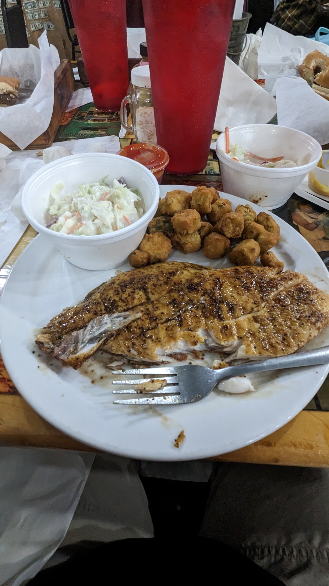 Read moreOur party of 3 waited about 20 minutes on a Sunday at noon to be seated. In the meantime we watched crawfish being cooked from a front porch bench and their setup was impressive! We were seated at a table that wasn't wiped down after the last patrons, but overall the restaurant and restrooms were clean. We stuck to the basics when ordering, and opted for 2 catfish plates, one with mac and chz substituted for fries. The catfish and hush puppies were perfectly cooked and the tartar sauce was a lovely compliment. We were not big fans of the fries (tasted like they had been frozen a long time) or mac and chz (the pasta was gummy and there wasn't much flavor), but we did see some greens and limas that another table ordered that we would try next time. The waitress told us sides are $3 each if you'd like to build a veggie plate. Ketchup comes in small plastic throw-away containers and they will bring more if you ask. Don't say no to the tartar sauce! Parking was easy with the overflow next door at Toney's liquor store. With the temperatures nearing 100, some fans on the front porch would be nice for people waiting. There were a considerable number of older people and it seemed a bit dangerous, especially when the gas fired up for cooking...