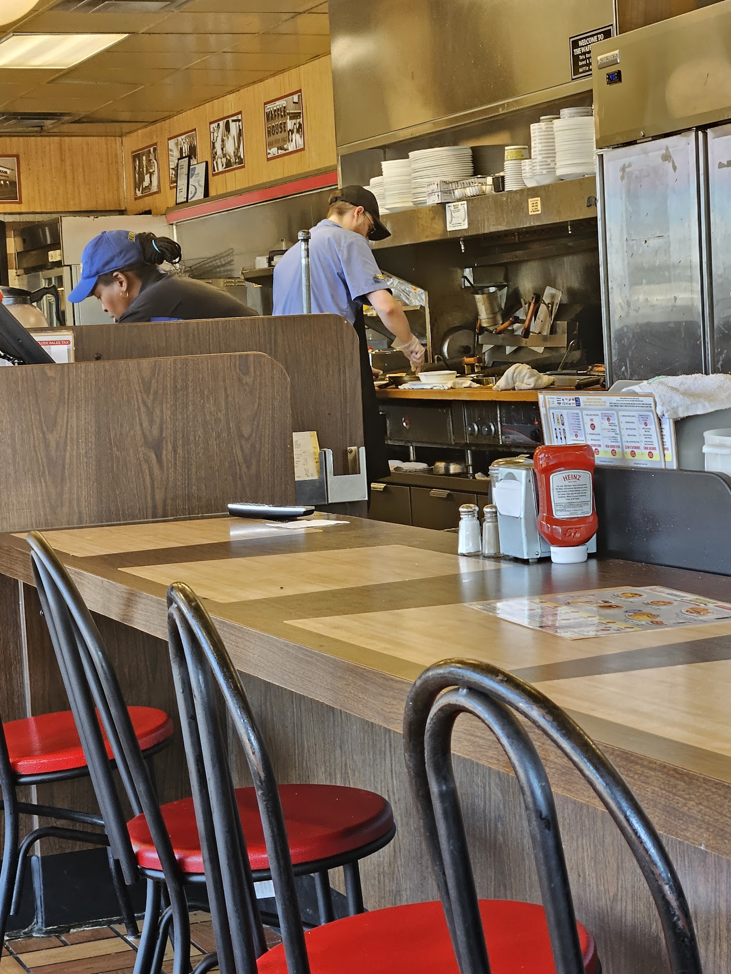 Rated 1 beware of eating at this diner not clean or sanitize. Employees doe not care.. July 1, 2021 around noon me and the husband decided to eat their after upon entering we notice the place was not so busy and one area tables was not clean and notice this waitress a large redhead female with dreadlocks sitting at a mess area with employees stuff on cellphone she got up to wait on customers never washed her hands used her nasty apron to clean silverware after other customers had used to serve to customers that was never washed and the Manager look notice her doing this and didn't say anything. After waiting on customer back to her cellphone never clean up in her area. Syrup jars are never clean sticky bottle. Health deptpartment need to investigate the windows ledge have dead bugs windows are never clean. When not busy all employee are on cellphone or sitting down. Only the manager area are clean. Notice all this waiting and decide ...