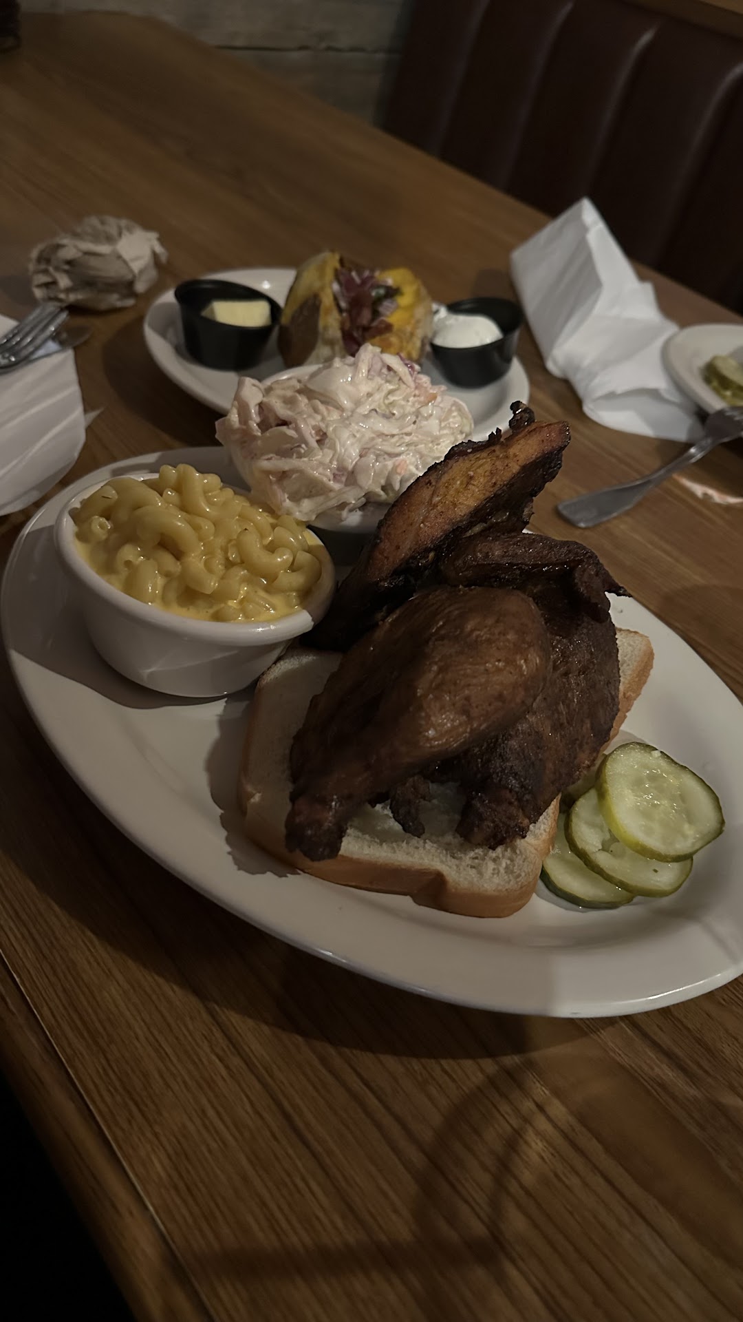 Read moreWe had spent the day in the Grand Tetons and were heading to our hotel in Idaho Falls when we realized we were hungry. A quick google search showed us this place along our route with decent reviews, so we decided to stop here. It was pretty crowded when we arrived, so we had quite a wait for our table, which was fine. One thing we noticed while in line and during our dinner is that a lot of people seemed to know each other here; I’m guessing this is a local favorite. The décor is great with a nice vibe. There is both indoor and outdoor seating. They smoke / grill the meat outside the back doors, so the smells coming in the restaurant were mouthwatering. The meal was good. The burnt ends were perfect and flavorful. The ribs were a little overdone, but still tasted great. The BBQ sauce is on the table to add if you want to, but my meat had enough flavor without it. My husband enjoyed his brisket. A couple nitpicks: Side salads are brought with the meal rather than before. So, you either eat your salad first (like a normal person) while your hot food goes cold OR you eat your hot food while it’s warm and are then too full for your salad. No refills on sodas. I asked for a refill and was brought another glass. When reviewing the receipt, I saw that I was charged for both drinks. Not a big deal,...