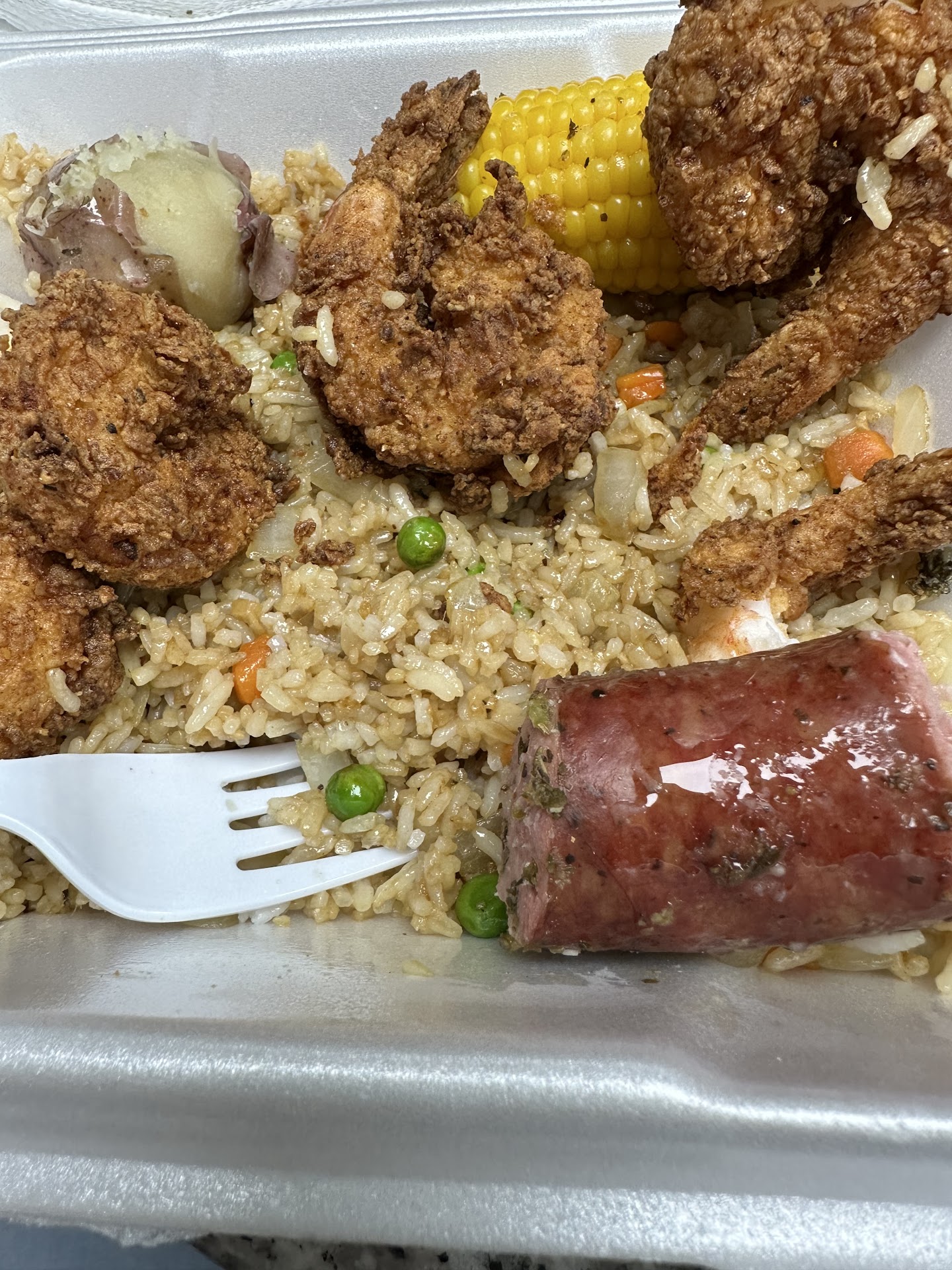 Read moreThis was my first experience with Cajun wok and it was challenging. I went to place my order for fried fish and fried shrimp, and was told we don’t have fried shrimp. As I looked and noticed over half the menu had fried shrimp. It was disappointing, after an audible for grilled shrimp it was okay. The fried rice bed had good flavor but over salted. The fried fish was Great, with a perfect balance of seasoning in crispiness that led me only to want more. The cornmeal batter made for a perfect crust that was perfect on everybody. I wish I had some tartar sauce, cocktail sauce, roll or bread to go with my meal of which were never offered. My fault for not asking or checking before I left As an as I thought, these were just typically acquire compliments Overall, it’s not a good value for your money. I wish I had my tie in condiments. The food taste and texture is on point but not...