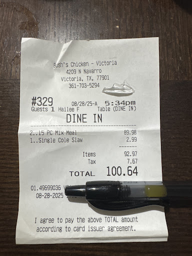 Read moreWe usually love Bush's but not today. We live an hour away from Victoria and when we go into Victoria we love to stop for fried chicken at Bush's. Yesterday we ordered quite a bit of chicken and tenders in fact, we had 2 orders, for two families. The chicken was so dry, no flavor, and the crust was so tough it could have broke a tooth. The mac and cheese was so watery it leaked inside the bag. It was more like soup. The mashed potatoes and gravy had absolutely no flavor. Our rolls were under the chicken and were greasy and mashed flat. We were very disappointed. I hope things impove, as Bush's is one of our favorite places in Victoria. On a positive note, our server was very nice and polite. The tea was very good. The Matamoros and...