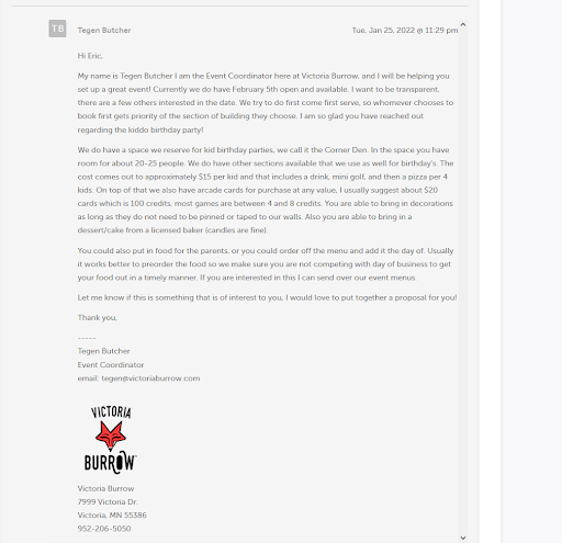 Read moreIt is okay. Tried to plan an event there, used the website to email about an inquire, said we would get a response the next day, talked to the individual who organizes the events in person 5 days later. Was informed that she sent an email out the day prior. we still reserved the spot in person, she told us that there would be another email sent to us to order food and what not, did not receive it, so I used the original email to send her a message confirming ordering food and the game cards, and never heard back from her. We arrived the day of, she was not there and there was no communication sent down to the other individual that helped us, and none of the game cards were ready as they said they did not get any of my requests.(see attached pictures) It took about 20-30 minutes to get the cards for the children and as you can imagine, they were restless and wanted to have fun. We did not get any mini golf as an option as was discussed in person, also my food order that I had requested was not submitted. Not to mention, one of the game cards that I got for the kids only had enough to play 3 games on and it was balanced to zero. The younger female in the gaming section did a wonderful job and correcting that for us. Thankfully we got their early enough to order our food, and that is one thing I do have to give them 3 stars on is the food itself. It was good, but if you are looking to plan an event, I would avoid this place, or check to see if they have their ducks together.