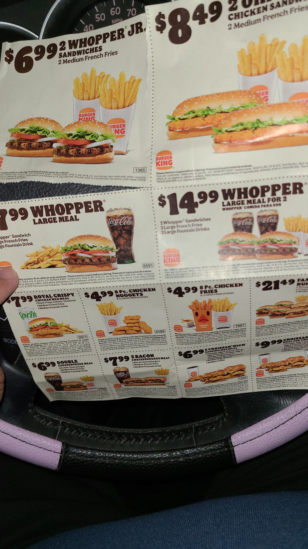 Read moreI came here to buy food for my family and went through the drive thru for my order. Order came to about 30$. When I got to the window I went to pay with my Samsung Galaxy S device. The lady at the window, an older Asian looking lady, immediately turned my payment away saying that their store doesn't accept that. So your store doesn't accept money? I asked. And she gave me every excuse under the sun why they don't take that form of payment. Even called her general manager and I talked to him on the phone. It was ridiculous. Bottom line is that yes they do take that form of payment but are unfamiliar with it and afraid to try something new because of narrow-mindedness to something possible obscure. After politely informing the lady that she was erroneous, telling her to try listening instead making excuses and making herself look foolish by contradicting herself in the many reasons why they don't accept this form of payment, I finally drove around, went inside and taught her how to accept this form of payment and explained that this was not anything to be alarmed about. Samsungs methods of payment aren't apples methods of payment, different tech is used for each. For this particular method I was using, I can have my phone at an ATM or card machine from 1993 and it will work. Once I showed her and my payment went through and was accepted. She apologized and explained she didn't know about this and that people bring their iPhones in trying to pay alot and so on. I just told her to open her mind a bit and don't be afraid to try something new. I have a certain bank who's cards seem to not last very long. The strips rub off after just days in my wallet. So at this particular event at Burger King I literally had no way to pay except for a 20$ bill and my Samsungs electronic debit card. Food was pretty good tho. Was a little cold cause I was...