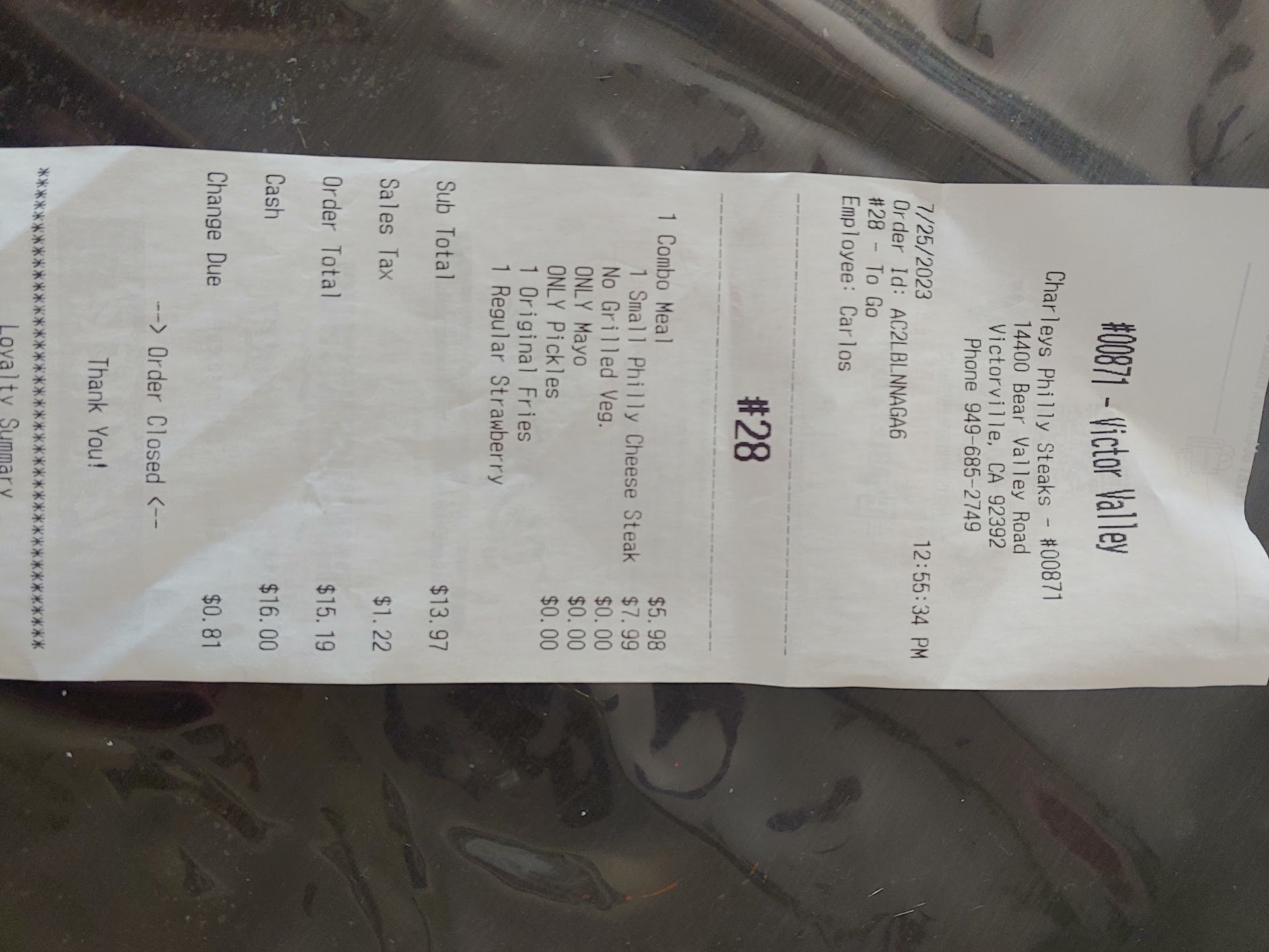 Read moreI decided to try Charleys, for the first time, in the Victorville Mall. They were out of onions. (That's a big one for a cheesesteak sandwich) Strike 1. I waited for 20 mins just to order. (Only 3 ppl in front of me) Strike 2. Then when they called order numbers, they they skipped mine! The person apologized and said it would be ready in 5 mins. Then she proceeded to call the next 2 numbers after me! 20 mins went by before I had enough! She asked if I wanted a refund, and that took another 10 mins! After all that I finally got my money back... Minus the hour of my life that I'll never get back. Even more insulting was missing the first half hour of my movie at the cinema next door. She didn't even offer me anything to allay my concerns. I will not let this one bad experience deter me from trying them again. But it will be with some kind of incentives. I've already given too much...