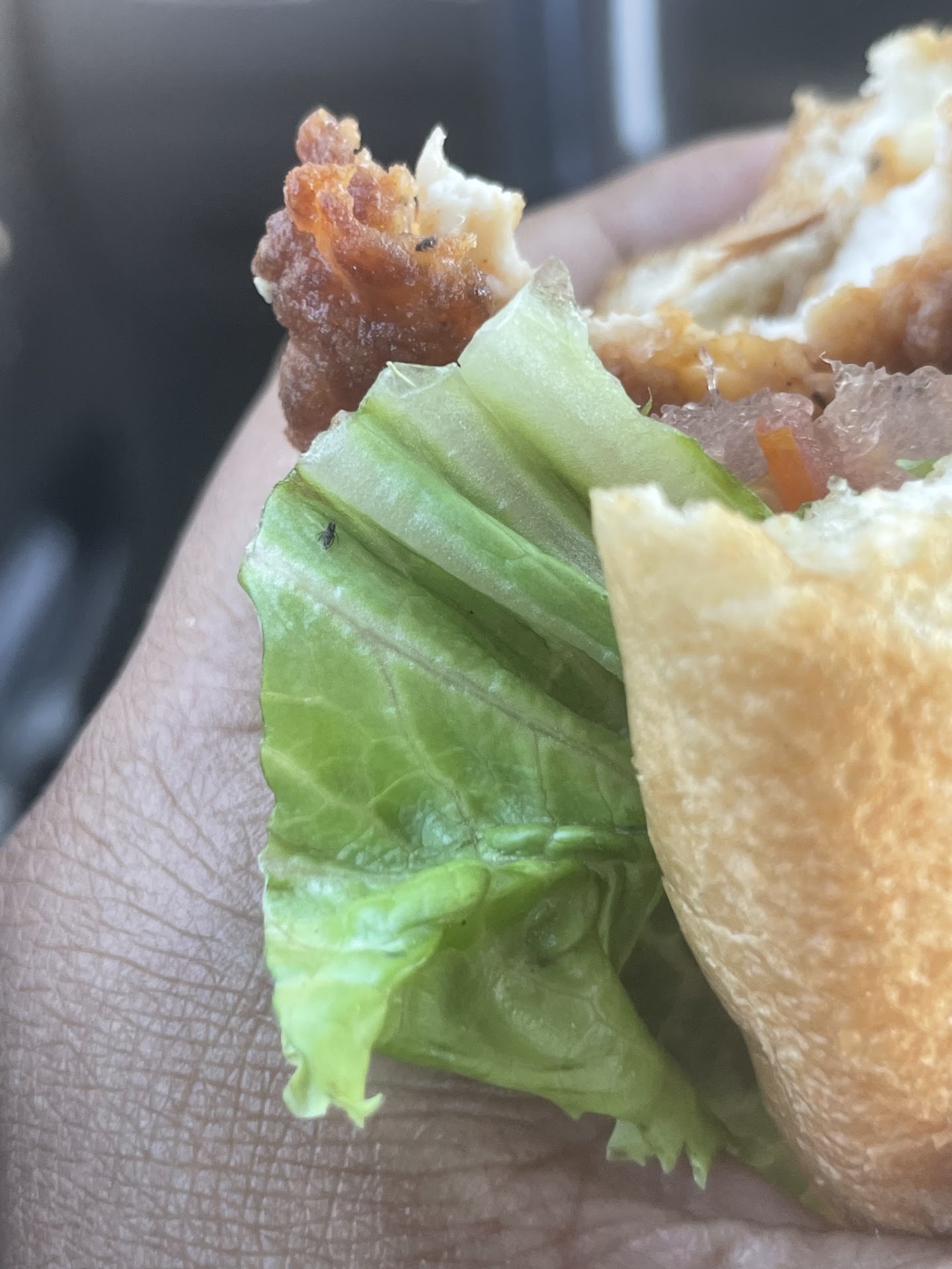 BUG IN MY FOOD. Terrible management skills(JESSICA). I ordered a spicy chicken deluxe meal w/ an orange juice in the drive thru - I received a regular chicken sandwich w/ American cheese accompanied with soggy fries. I immediately brought it into the store and requested what I had ordered and for the fries to be remade - they gave me my order and I asked for a cup of ice for my OJ. As soon as I get back to the car I notice it’s the same fries, but I didn’t go back in because I got my sandwich this time. My sandwich is soggy because they put extra tomatoes (for whatever reason possessed them to do so) I get about halfway when I bit and had a crunch with a funky taste that lead me to look at it closer- there was two bugs in my food. Both dead, one in the meat and one on the lettuce.