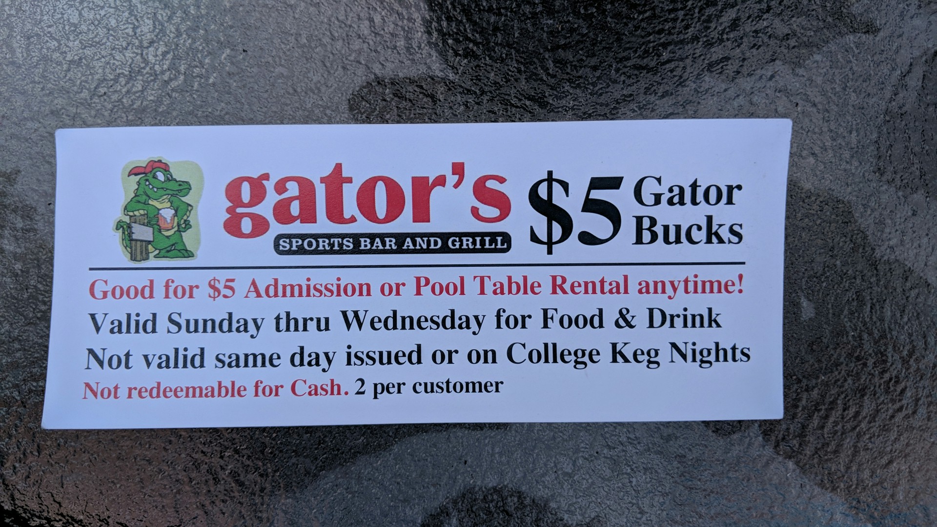 We went to pay the tab, about $120, around 1:30am and gave the bartender the gator bucks. She said that they are only valid Sunday - Wednesday. I explained that we were told we could use them that night. I explained it is Sunday and that we we would like to use them. She said it was Saturday. I asked her to look at her phone and tell me what day it said, she said it showed it was Sunday. I said then I would like to use them. She said you can't, I asked why, she gave no explanation. The gator bucks state that it's not valid on the same day issued but since it was Sunday we should have been able to use it. I attached the picture to this review.