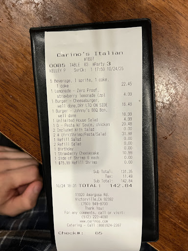 Ā Ā Ā Read moreJohnny Carino's turned into a complete mess. Ordered a steak a shrimp meal that comes with pasta and salad. The salads good, that's about all that was good about it. I got the food and I took a bite of the fried shrimp and it was pretty much raw. I cut the tiny tiny steak I got that I ordered medium rare and it came almost blue rare on one part with some areas being over cooked somehow. Then the pasta was completely cold.