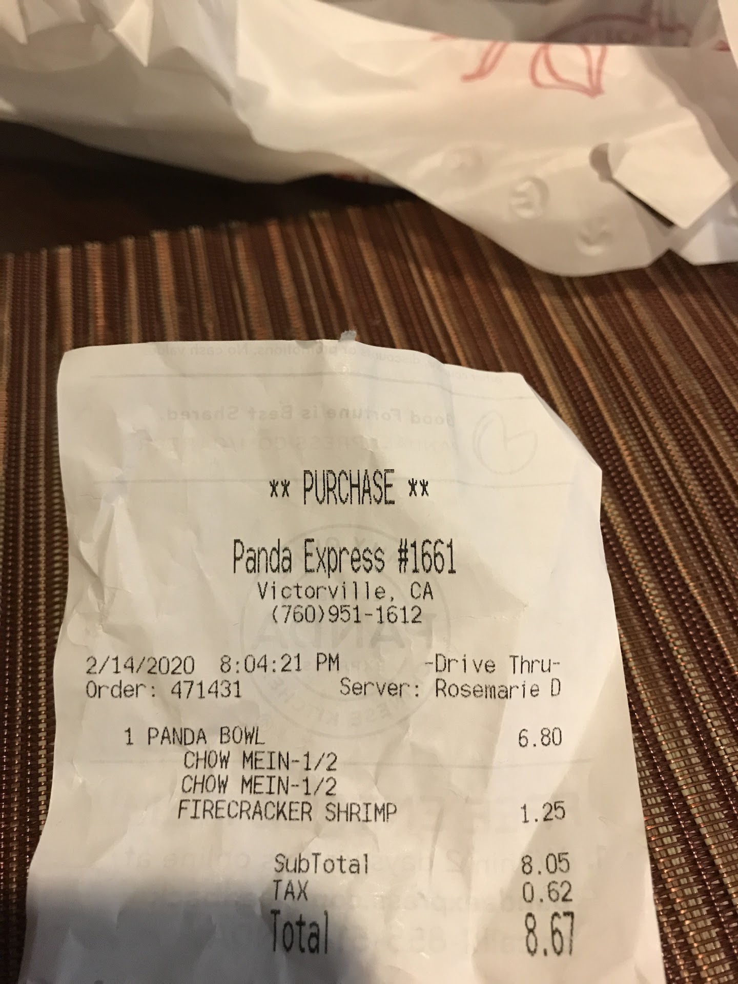 Read moreI go to panda express on a regular basis. I went to the one. On 7th street in Victorville and I was very dissatisfied with the portions that the young lady put in my to go box, she didn't even feel up the scooper on several items and I bought extra items in cartons and I had to ask her to please, put more orange chicken in it. And the Shanghai beef. It was a very skimpy plate here. Do not like how they are adding so much cabbage to their noodles, its way too much cabbage noodles are cheap, I don't understand why they're doing this, but I think I will probably no longer be buying food at panda, express the last 3 trips to this location have been the same, and I think I spent almost 21 dollars and it was not enough food, there were 2 of us that were eating when I go to. Find Palmdale road. Their portions are more generous, and when the girl put a little more food into my plate, she only put like 2 pieces of each item that I asked her to add more, too, and she kept looking over her shoulder like she was going to get in trouble so my revisit to panda is going to be...