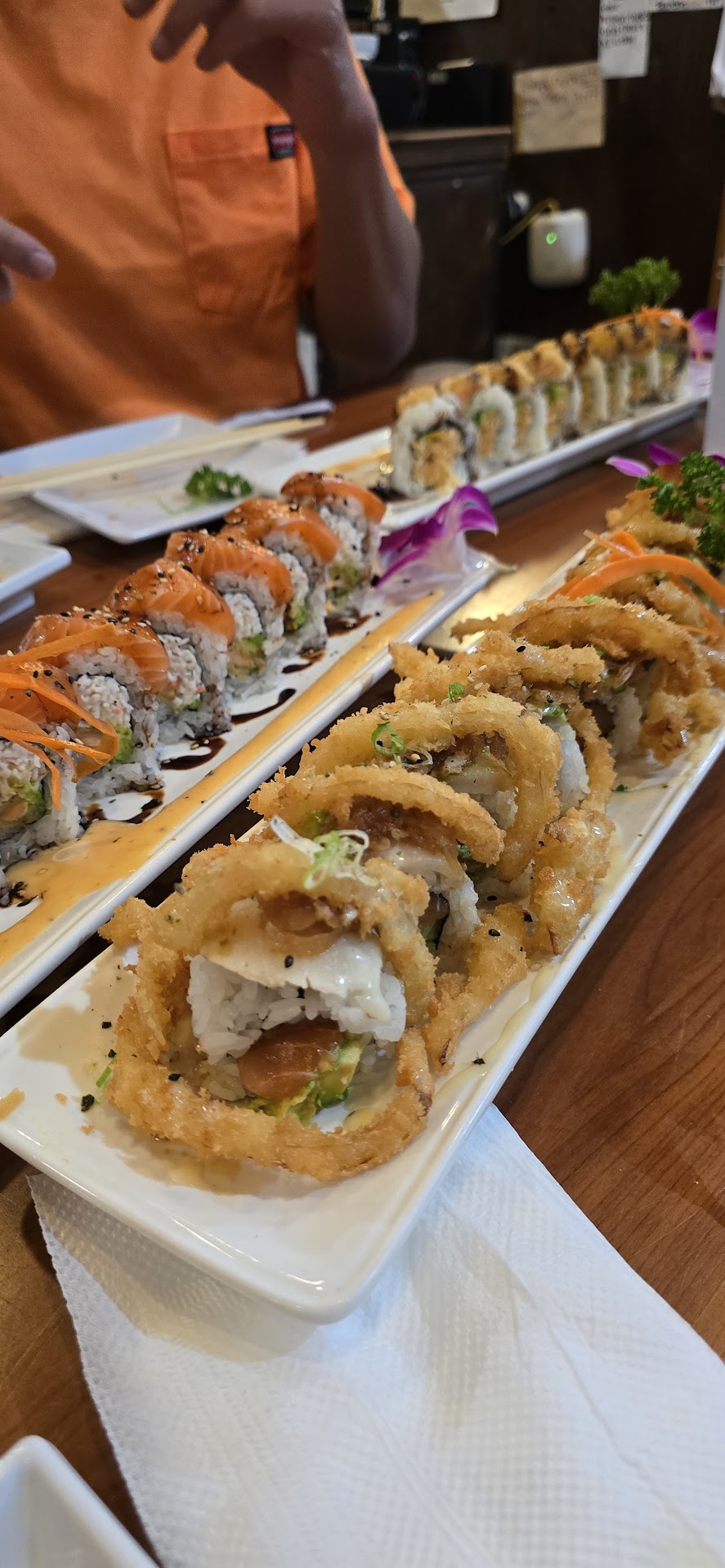 Read moreHoly moly!!! This place is great!! So the fish is fresh, the rolls are perfect size, and wow, the SAUCES!!!! The sauces are delicious!!! New favorite sushi spot. The crab mussels are way better than loaded mussels (which are a favorite for me anywhere they have them). These blow those out of the water, with a little lemon juice, just perfection. The pepper salmon was so soft and perfect pepper on the edges, dip in soy sauce for a salt and pepper taste. The hand roll was fresh and the seaweed was crisp, not soggy and hard to bite. The Superman burrito was a mix of perfect flavors, and the sauce that it comes with is not spicy more sweet. Definitely recommend the tempura Shishito peppers if available (i dont think they are on the menu, so ask, they aren't spicy). Also, get mustard sauce to dip EVERYTHING in. It's sweet and tangy, and it goes well with everything. Chef Martin and omar are great at what they do, and our servers Lilian and carla were doing great trying to keep up with a Saturday night rush. Please try this place at least once if you are a...