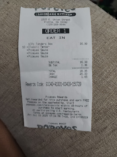 Ā Ā Ā Read moreFrom the outside, it initially appears that the establishment is closed down; indicated by faded paint, lack of signage, and a rough parking lot. Upon entering, it was apparent that lack of staffing resulted in a less-than-average cleanliness level. The interior of the restaurant wasnāt dirty enough to complain too much about. The bathrooms however need attention. The experience with the staff was fine, contrary to reviews of a rude staff I found that the employees were helpful and accommodating. The wait time for the food was average; it didnāt take long for our food to come out. When it did, it was hot and tasted fresh. The chicken tenders were juicy and tasteful, along with a delicious side of mac and cheese that I had ordered. This was my first experience trying Popeyes, and other reviews about this particular one may seem scary, but I think it was a cost efficient and flavorful meal. I had to take a star off of my rating due to the looks of the building inside and out. The restaurant itself just needs a few minor cosmetic upgrades and I think it would be a great...