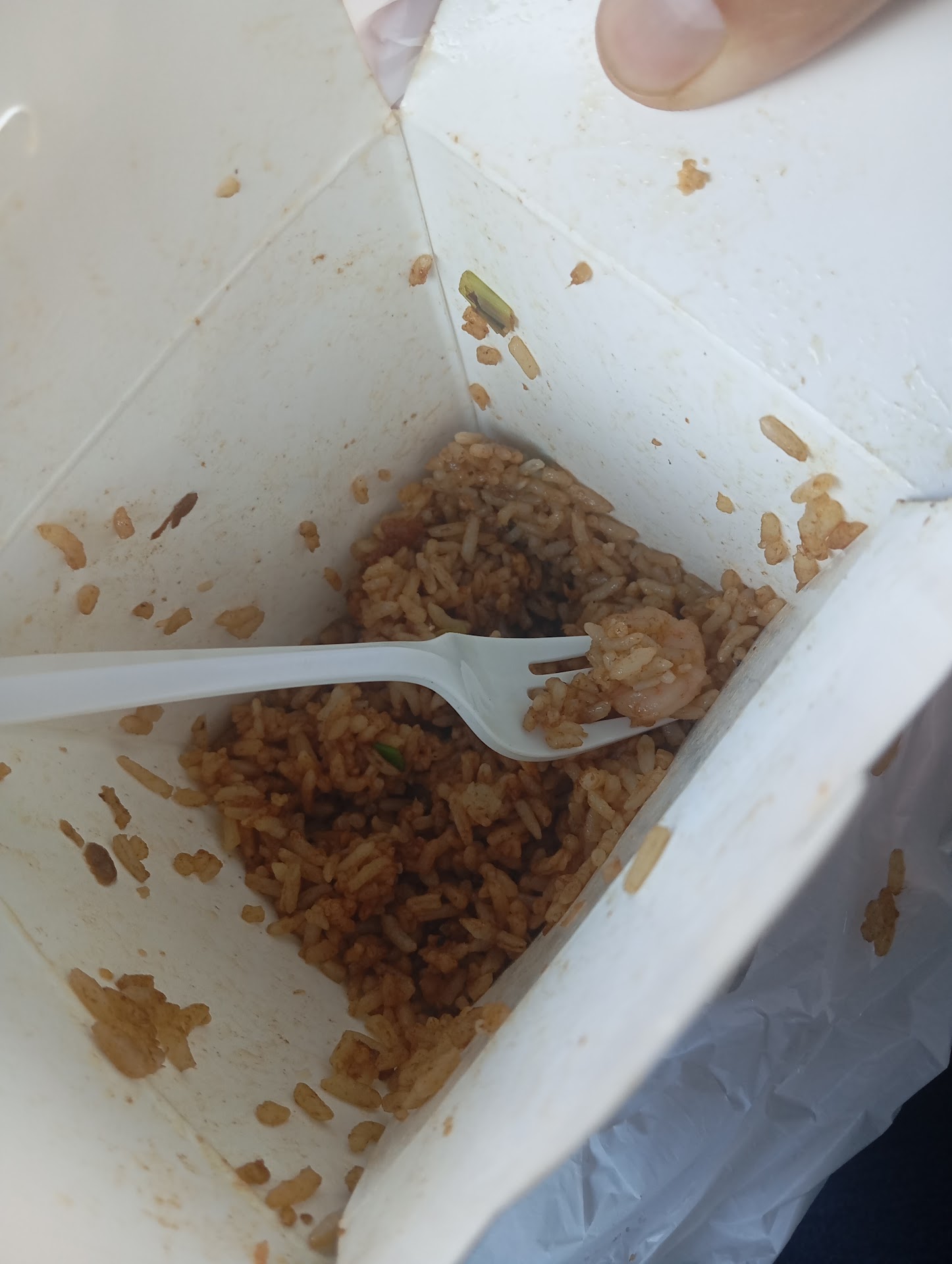 UPDATE: I'm posting my paper plate the day after my original post. Half chicken and half shrimp fried rice. Found zero shrimp (but shrimp tail skin was in there)and 1...