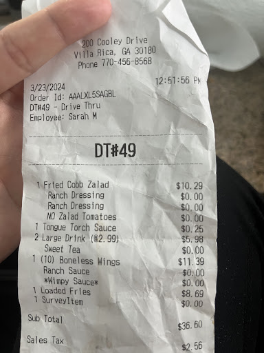 Today 3/23/2024 My husband went to this location specifically and ordered me a COBB SALAD! For lunch. He had already had to go back in to receive the sauces we ordered and got charged for. Needless to say when I received it the salad only had lettuce, chicken and cucumbers on it. Why is this? I have no clue. Being the person I am I do not normally complain; but for the fact you are skimping me on my order of course I’m going to call with concerns. The manager was not only ruthless with what she had to say over the phone; telling me it was rung up as a “house salad, and she remembers making it” as my husband hands me the recipe, it was clearly rang up as a Cobb Salad. Not only did she lie to “cover” herself, She proceeded to laugh when I told her I wanted my replacement today because I won’t be eating what I received. Might want to look for her replacement soon and laugh in her face when you do so. This customer will not be returning anytime soon.