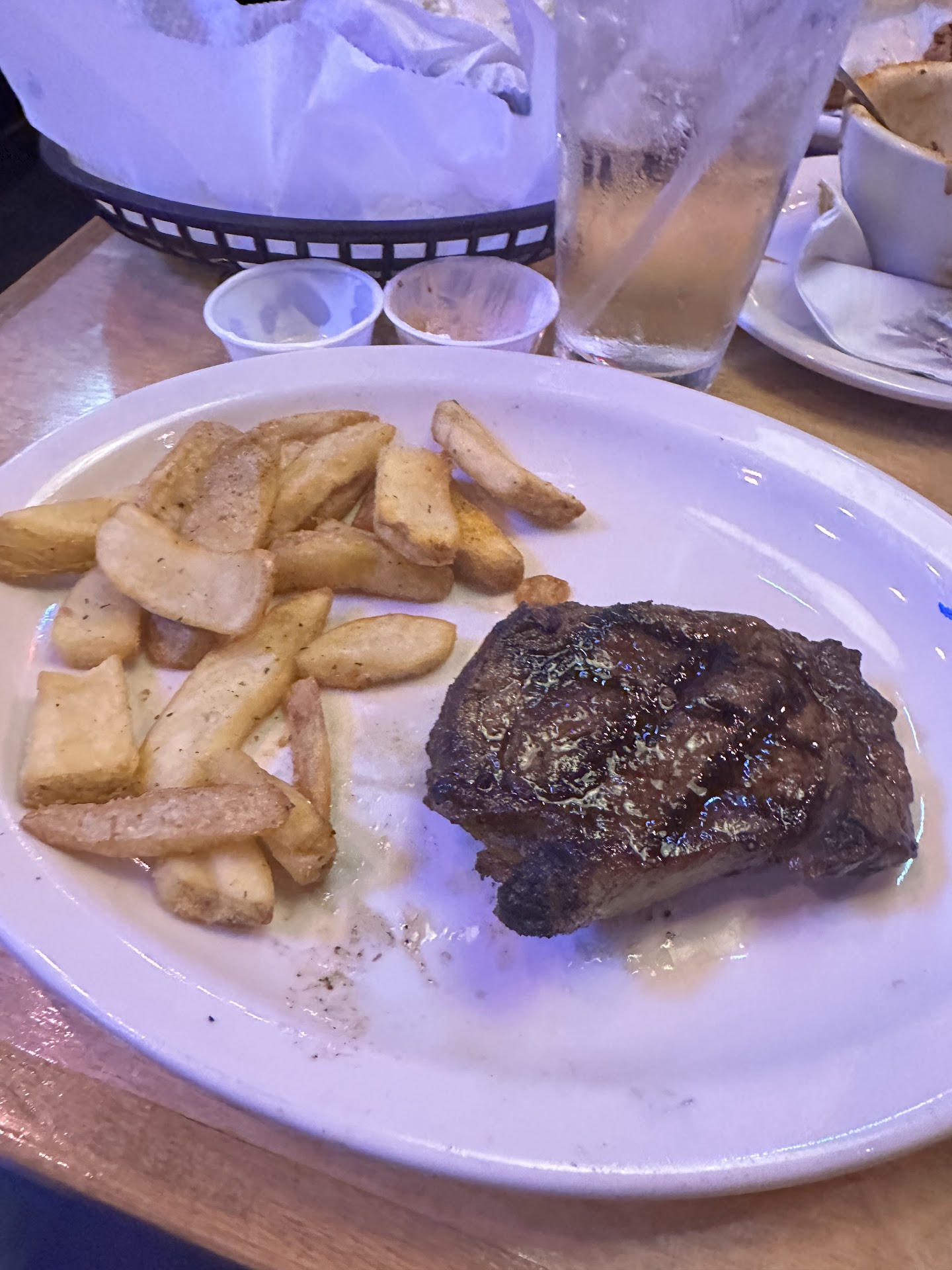 Server came out to get our order. We ordered everything at once. Drinks, starters, food; thinking this would make it easier. Couldnāt have been more wrong. Drinks came, starters came, food came⦠just not all of our food. Apparently a malfunction with the computer (or wasnāt entered to begin with) deleted my order from the system. After my family was half way through their meal, our server (who was MIA for most of our visit) finally came by and apologized for the mix up and told me the kitchen was putting a rush on my steak. After my family was done with their meal, mine finally arrived⦠with the check AND to-go boxes. But it doesnāt stop there, my steak was completely wrong. Strip instead of ribeye; well done instead of medium. But, what was I going to do, send it back after waiting 30 minutes to bring it in the first place?