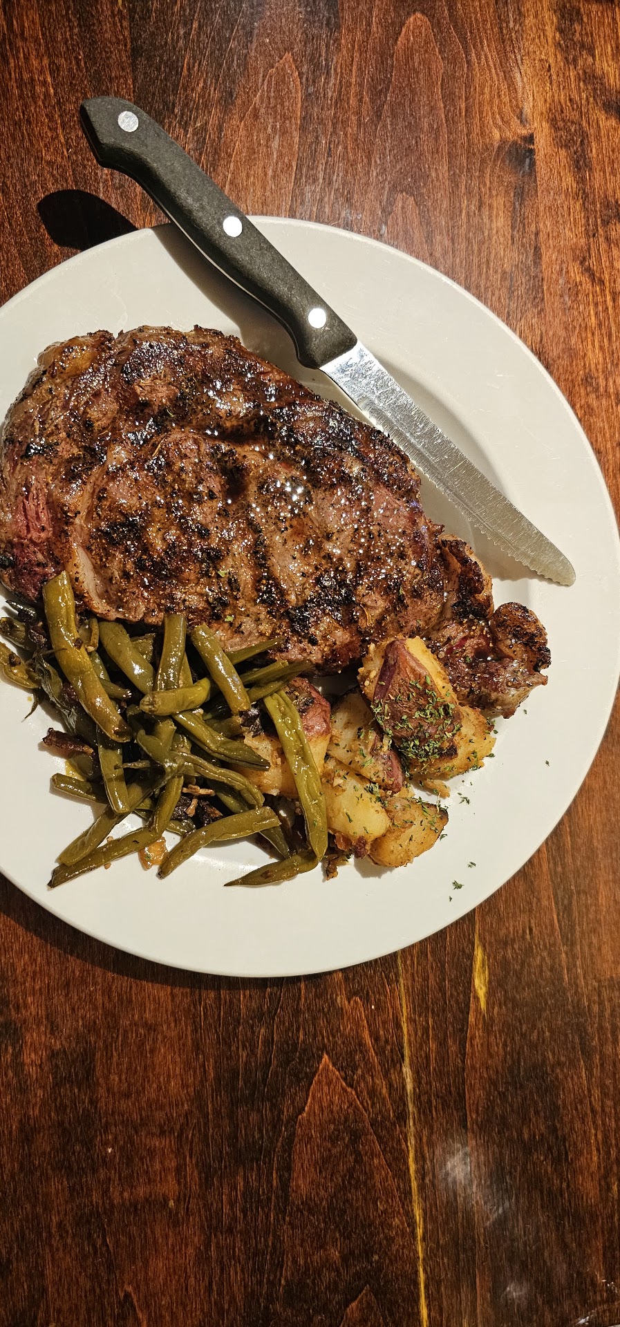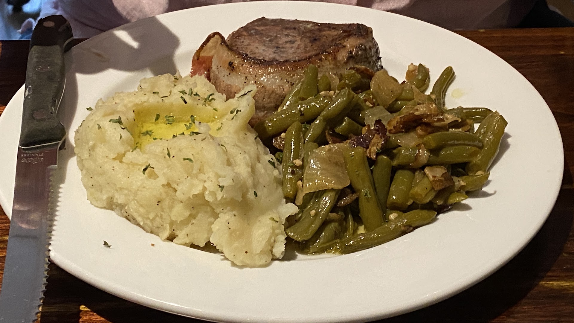 The mash was quite respectable â not fabulous, but fabulous in mash is difficult and rare, so we couldnât reasonably expect better. The asparagus very good, maybe cooked a bit past ideal, but very good; on the whole I would have preferred it grilled, though. The green beans, on the other hand, were definitely overcooked, to the point that the added bacon and onion was no help; it wasnât mush exactly, but it was in the neighborhood.