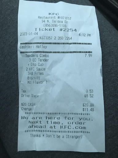 Read moreWorst customer service ever! I would give the restaurant employees no stars what so ever instead of the one! Ordered a family meal, drive thur service paid $52 was given the food in a paper bag no problem. Arrived home as I am walking inside the paper bag handle tore off and bag ripped down the side. The bucket of chicken and 2 of the sides fell directly onto the ground. I called the restaurant in hopes that they could help me somehow maybe a small discount, if the items that touched the ground couldn't be replaced. Well employee showed no interest in any way of helping me out instead I was told that it didn't occur on the restaurants grounds so it could not be replaced, I was told I should bring my own bags to carry the food in instead if I assumed the paper bags provided by the restaurant arent reliable to hold the order. Lastly that it probably would have not happened if I carried the bag with both hands. Well I checked the written label statements on the paper bag and it does not state anything about holding the bag with both hands and not by the handles. I highly recommend that the restaurant pack the customer's orders in boxes instead makes more sense if she insist I should have held it with both hands. She also went ahead and stated that I was the only customer who's bag has ripped she hasn't heard of it happening before! Well lost dinner for my family plus the $52 I paid for the food. Thanks KFC wouldn't be...
