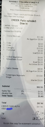 We were handed a paper receipt and a pen at the end of our meal. We were sitting outside on a metal mesh patio table. How are we to sign this receipt? Are you telling me this restaurant does not have a guest check bill card holder for the waiters? We were shaking our heads and laughing. If it were windy, this receipt would fly across Powers Ferry. At this point, we were saying, "Letās get the hell out of here. Never again."