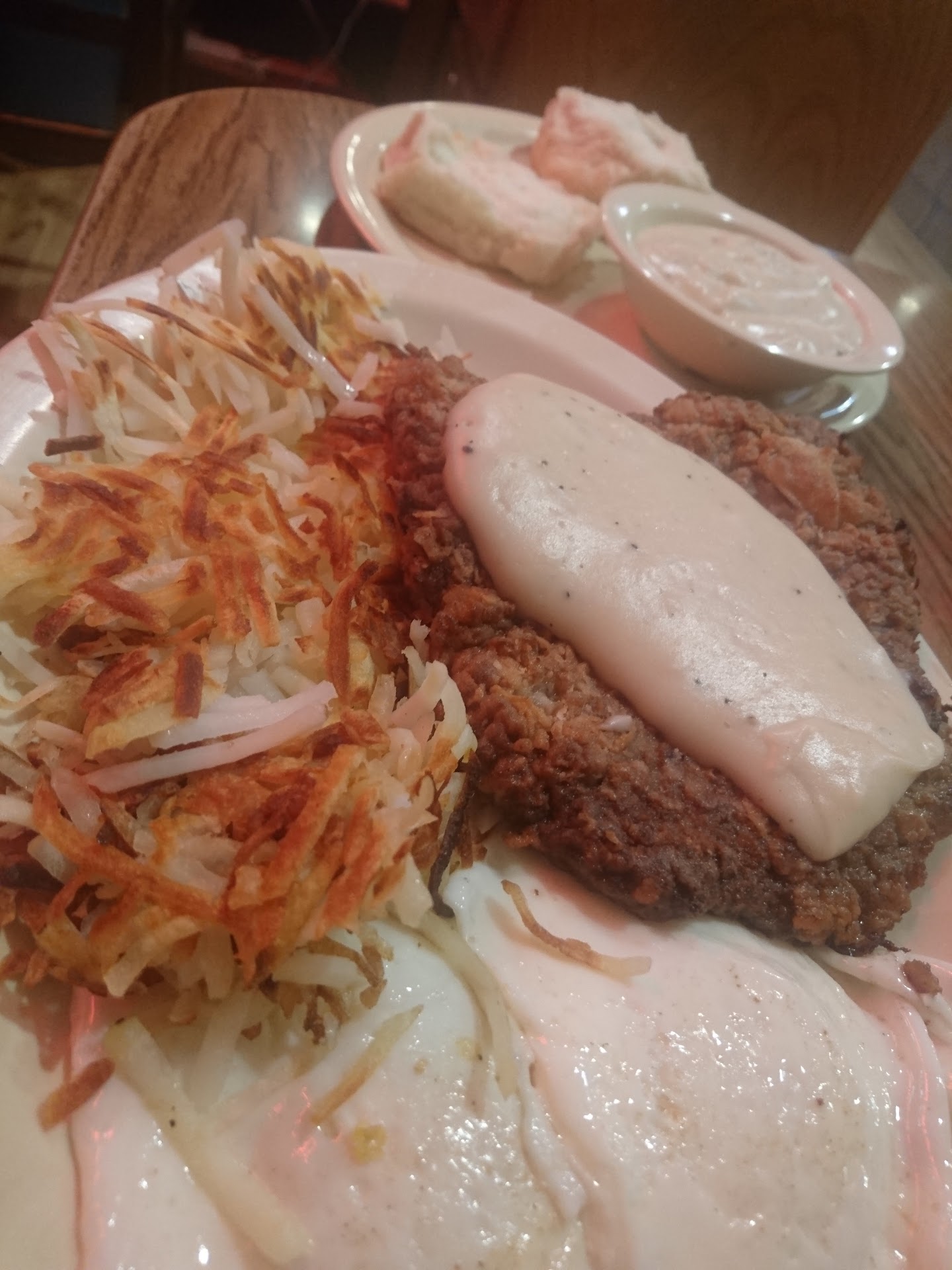 Read moreStopped in on a road trip headed south. The place was full around 9 am which may account for the twice fail for my order. Having seen the recommendation from Diners, Drive-In's, and Dives, my partner and I ordered the chicken fried steak breakfast. I ordered mine without eggs and answered yes to gravy on the steak. When the order came, it had two eggs and no gravy. I sent the plate back and it returned with no eggs and still no gravy. Fine. Since I'd opted for the biscuit and gravy with it I just dipped my steak bites in the biscuit gravy. The waitress was kind and alert and did bring me another gravy after observing me dipping my steak in the biscuit gravy bowl. When the check came, we asked it there was a discount for not having ordered the two eggs that come with the meal. We were told they don't have discounts. It's the restaurants prerogative, but not a pleasant one if you can't customize the meal easily. When we found that out we asked for two scrambled eggs to go so at least we didn't lose the money entirely and the waitress compensated us with honoring our request. The chicken fried steak was nice. It wasn't over breaded or too chewy. It also wasn't packed with lots of flavor. The hash browns were crispy to burnt. The biscuits were nice and fluffy and overall we were more happy with our food than not. Nothing was exceptional in flavor and the hassle of the order process results in a 3...