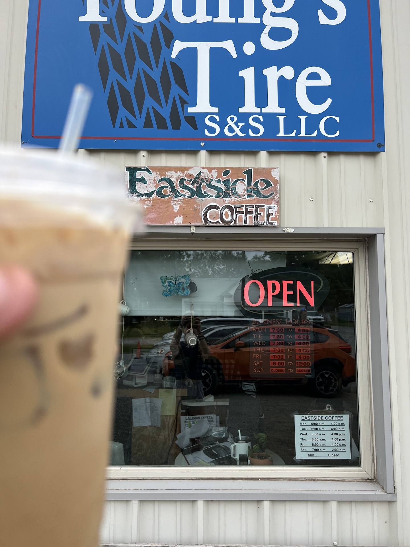Read moreAbsolutely fell in love with this place! My dirty chai was delicious and my boyfriend’s white mocha was strong and tasty! Everyone walking in seemed like they were all family it has such a welcoming energy, lots of love in this shop! I can’t wait to come back. I would recommend this place if you just want to come to the drive thru for a tasty drink but even more so to head inside this “tire shop” to meet the owner and her...
