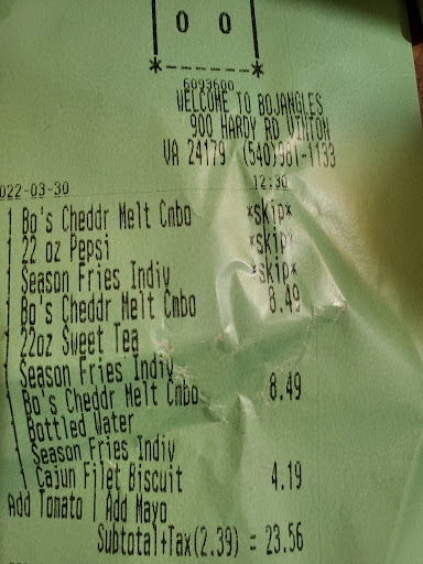 Read moreIt's always a hit and miss! It's 50/50 on fresh chicken and if you go after 8:15 P. M. Because they close at 9 you get what they have to offer. Are you simply will get nothing. And if you go thru drive thru make sure to double check for your plastic ware 3out of 5 chances you don't so good luck eating your sides. I'm not crazy about using my fingers. And my last visit which was done in the cashier was simply just rude and not only to me but the gentleman who was next in line behind couldn't believe there shortage on items and of course the cashiers rudeness once again. When I quietly bought it to the managers attention who I'm sure didn't speak much English she just smiled and said oh I'm sorry smiled and kept getting it. Leaving her actions for the cashier to see she could continue to be rude! What happened to customer service people?? It would be a pleasant experience if chick filet could train the Vinton Bojangles staff how to treat guest that are pulling money from there pockets and making a decision to drive there and eat that they were appreciated. But most of the time you don't get a hello nor a thanks and never a good bye! It makes that KFC down one block look better and better at least they say...