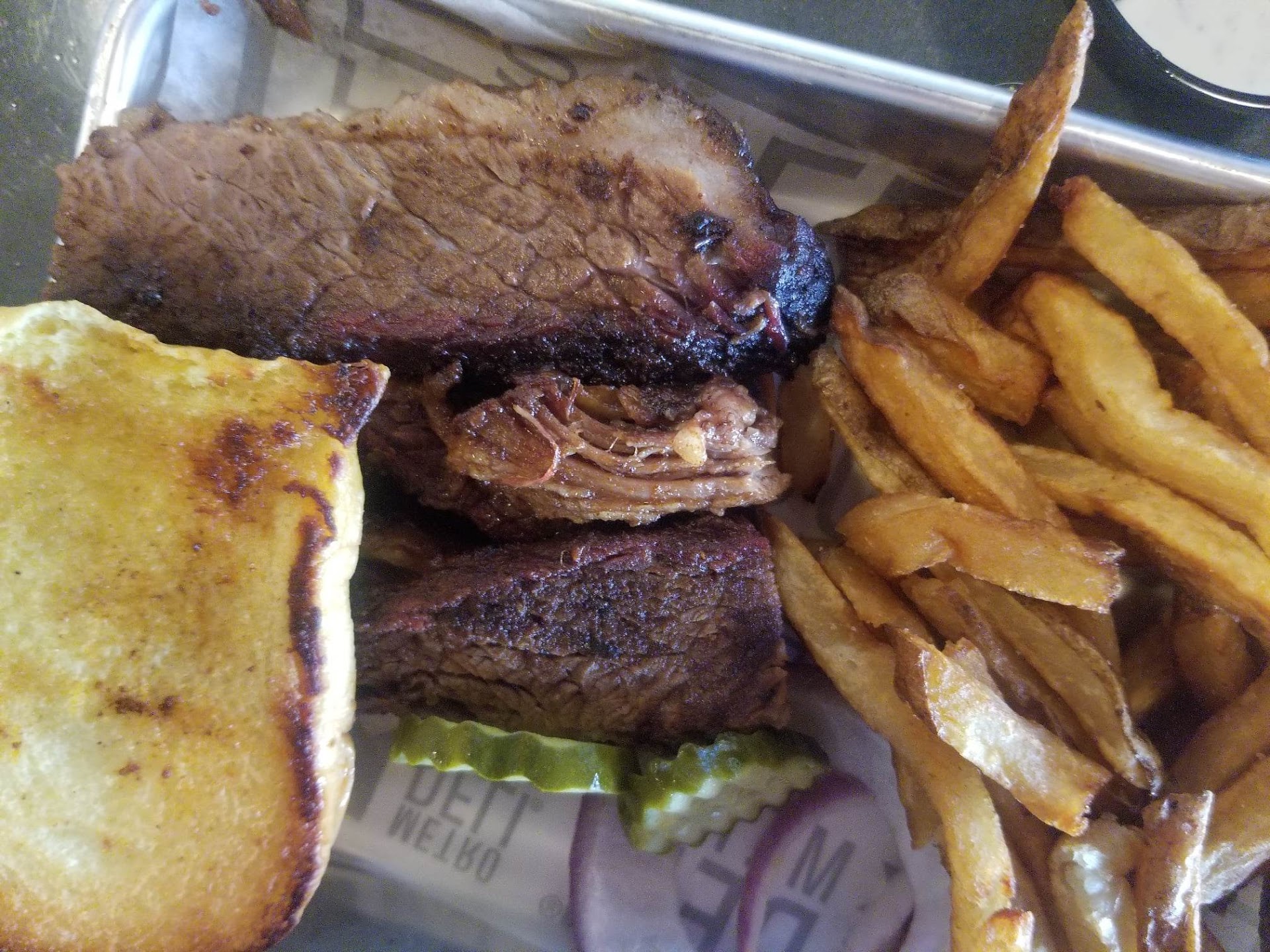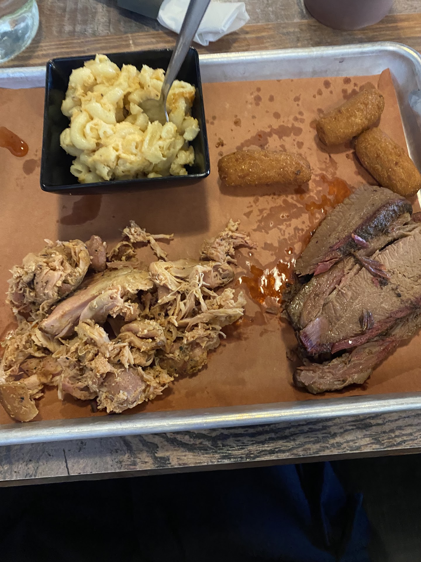Read moreStart to finish, walking in the host was not aware of tables that were open. Advise she walk a lap around the dining room ever so often to see. Sat at the bar, and was served by Jayden. Very polite and attentive bartender 👌. Ordered the Crown of Vinton mix beverage, and it is delicious. Started with wings great smoky flavor, sure they would be excellent naked. However, Jayden did bring us a variety of sauce samples from the kitchen to try besides the 3 on the table. Silverback kinda honey mustard with little break with vinegar, Virginia Gold like a gold BBQ with vinegar but very little, good. Texas "Q" was great. Now I had a sliced brisket sandwich with fries. Comes with onion, pickle and slaw on the side, it was really good. My partner tried it all. The ribs flavored well but seemed to be over rubbed. Pulled pork dryer than performed but great taste. Slaw is a good basic slaw. Mac and cheese, although the flavor was there, it was a little dry. Collard greens were cooked well but too much sugar. Hushpuppies small, cooked well, kinda taste like a Jiffy mix with a little corn meal. Would be Excellent with a honey butter. My takeaway is that my service was excellent and the food is on the right track. Everything doesn't need a dash of sugar or a drop of vinegar, though. Even the ranch had a sweet taste. I will be going back to give them another shot. Final observation the host over states wait times, but those kinks will work out once they learn the flow in the dining room. PS. Food came out a lot faster...